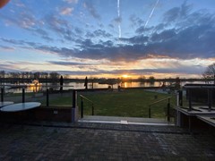 Vanuit de zitjes en tafels kijk je uit over de Maas.