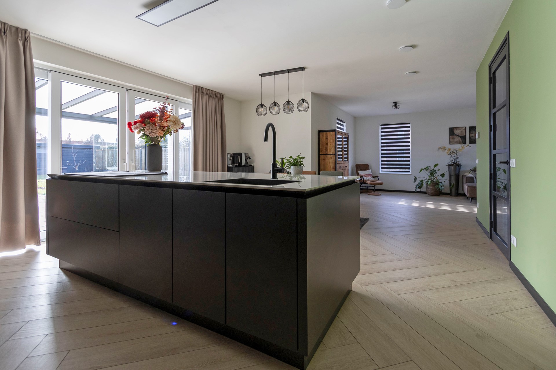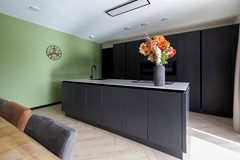De woonkamer biedt een fijne zithoek en staat in open verbinding met de luxe Siematic keuken. Deze keuken is uitgevoerd met een stijlvol kookeiland, een groot werkblad en hoogwaardige Siemens apparatuur, waaronder een grote koelkast, vaatwasser, twee combi ovens en een inductiekookplaat met afzuiging.