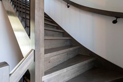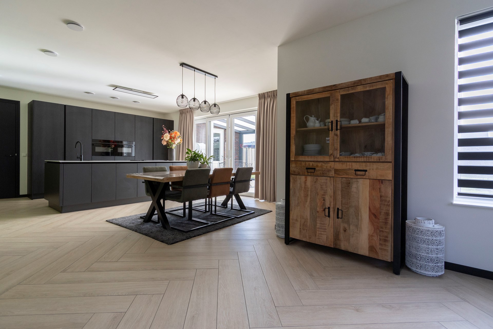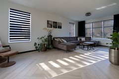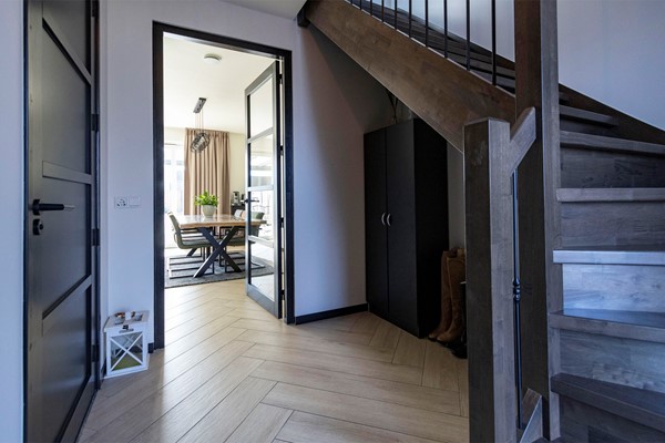 Via de ruime ontvangsthal heb je toegang tot de woonkamer met open keuken, het toilet, de meterkast en de trap naar de eerste verdieping. De gehele begane grond is voorzien van vloerverwarming en een chique houtlook vloertegel in visgraatstijl, wat zorgt voor een luxe en warme uitstraling.