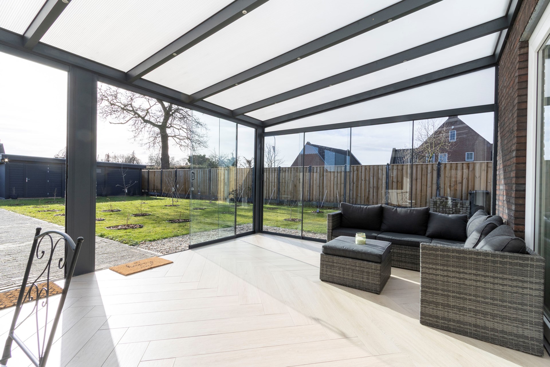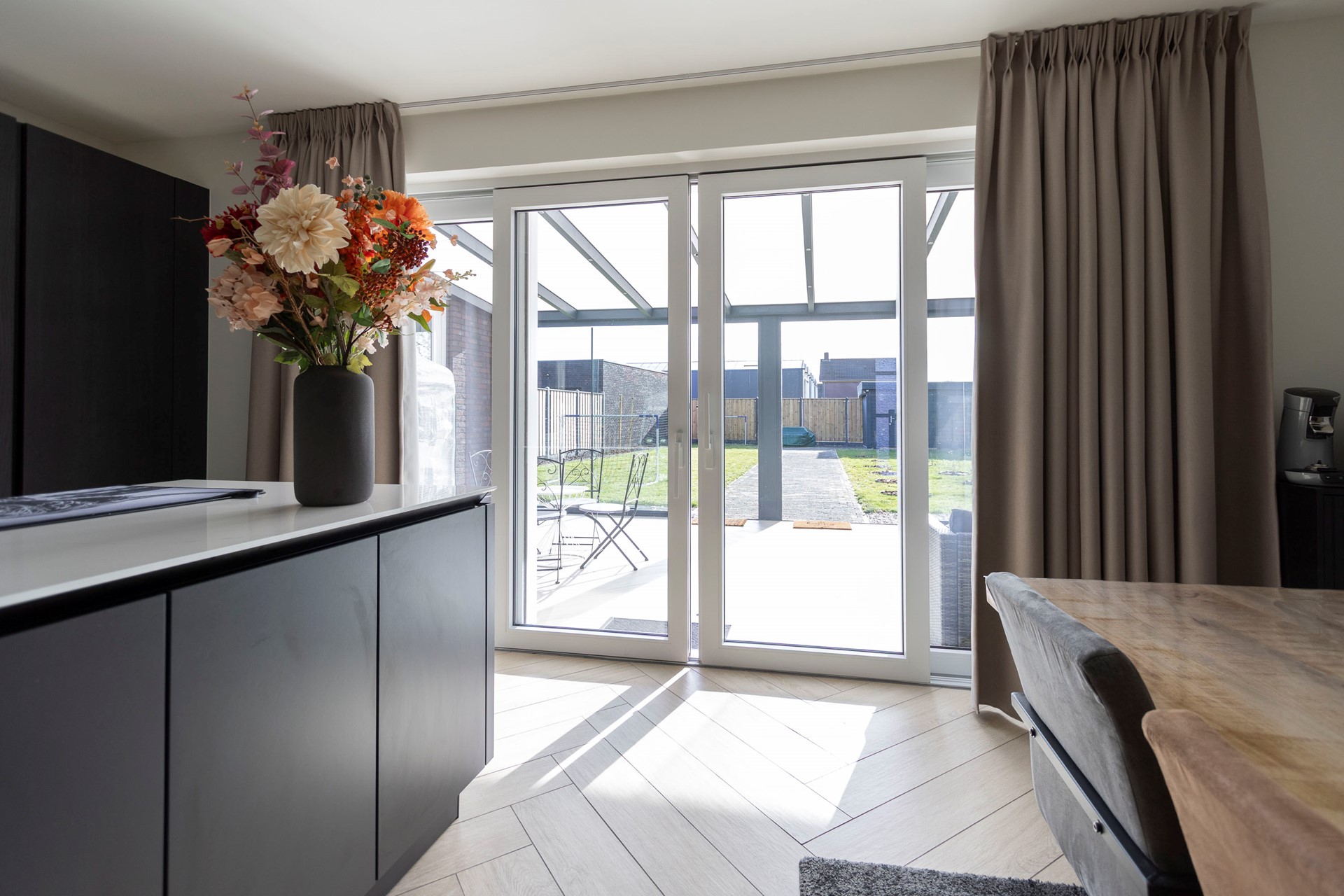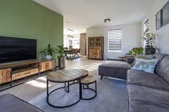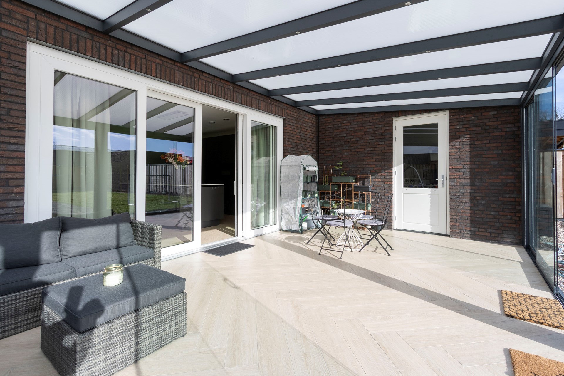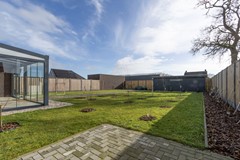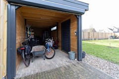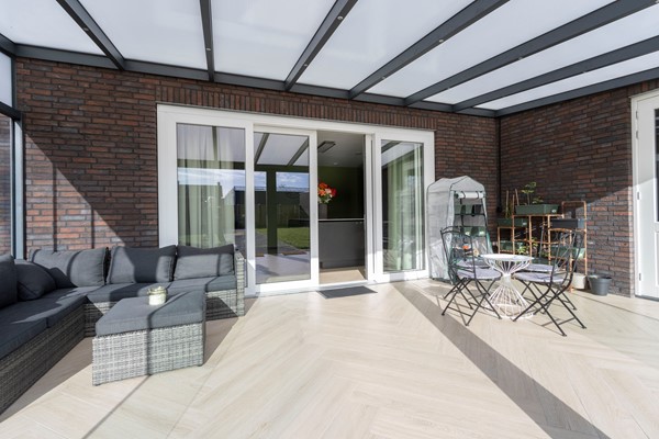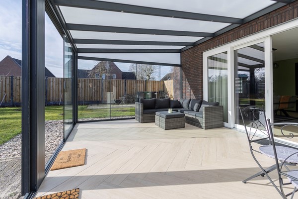 Vanuit de keuken, middels een schuifpui, stap je direct de serre in: een knusse, lichte ruimte waar je het hele jaar door heerlijk kunt zitten. Vanuit de serre is de berging bereikbaar, waar de warmtepompinstallatie en de witgoedaansluitingen zijn ondergebracht.
