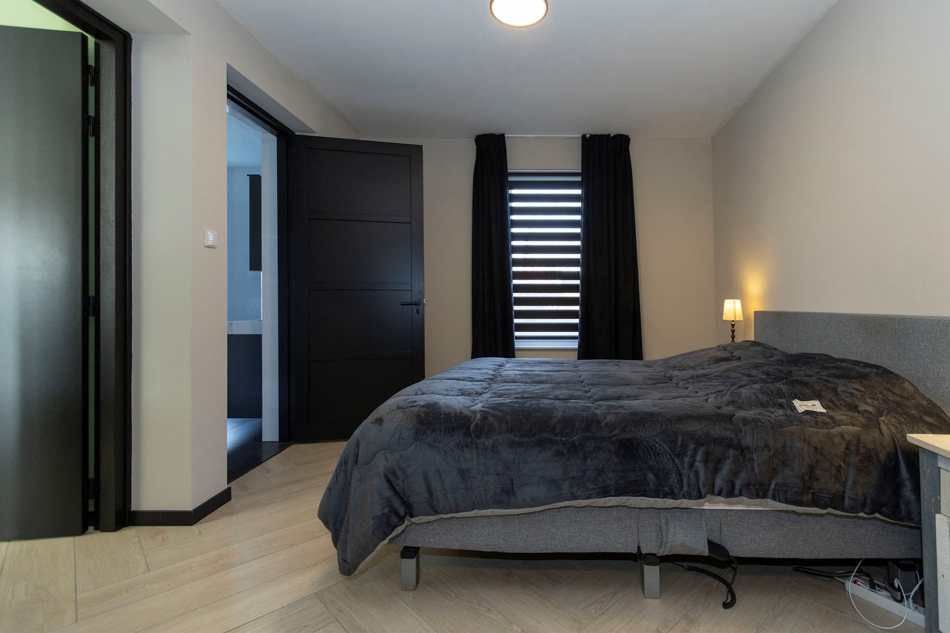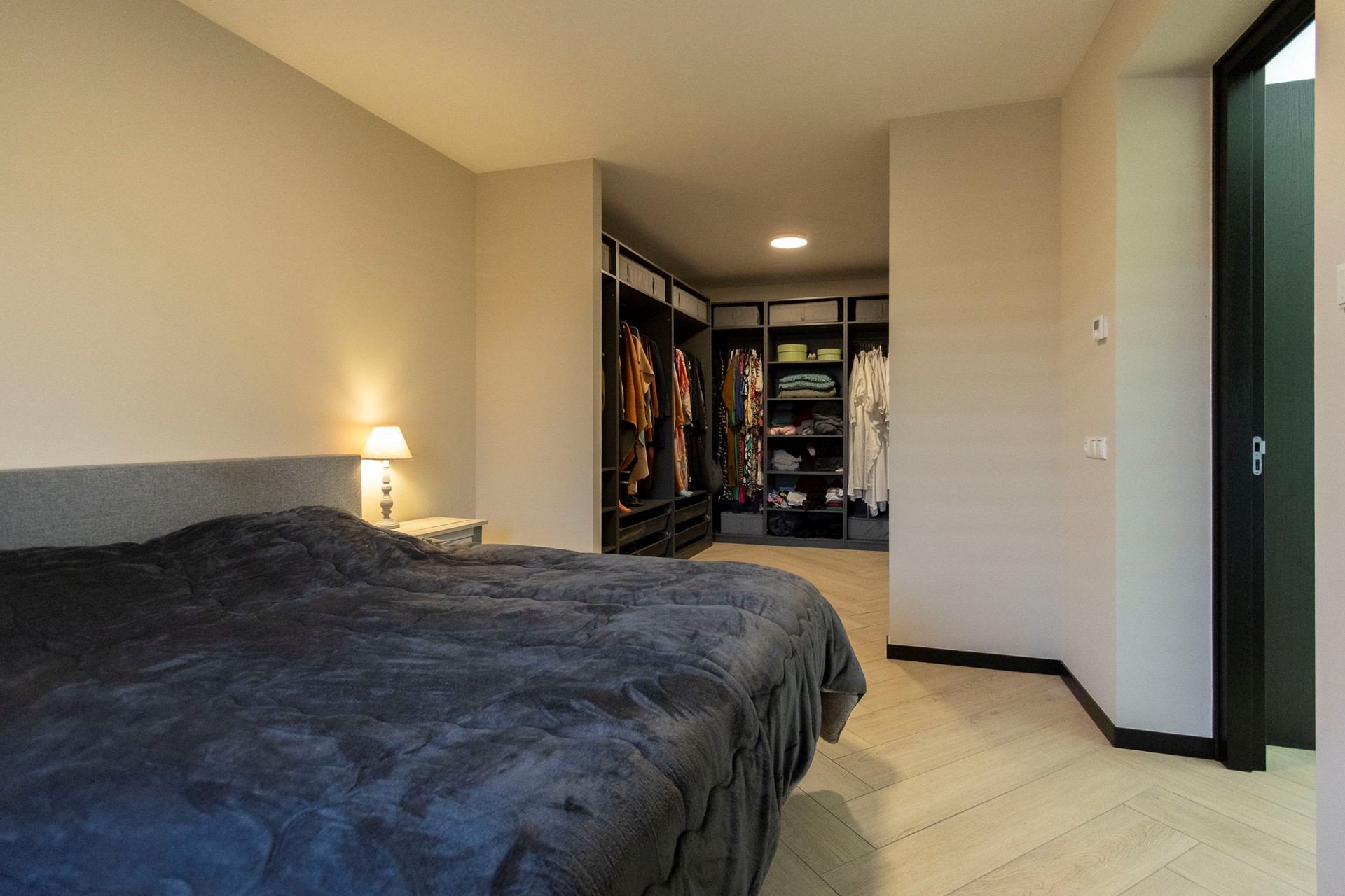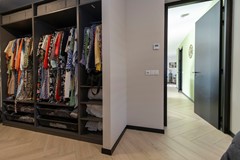 Op de begane grond bevindt zich tevens een royale slaapkamer met inloopkast en een luxe ensuite badkamer. Deze badkamer is uitgerust met een inloopdouche, ligbad, wandcloset en een dubbel wastafelmeubel.