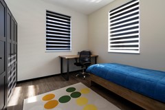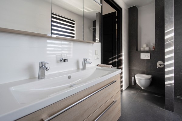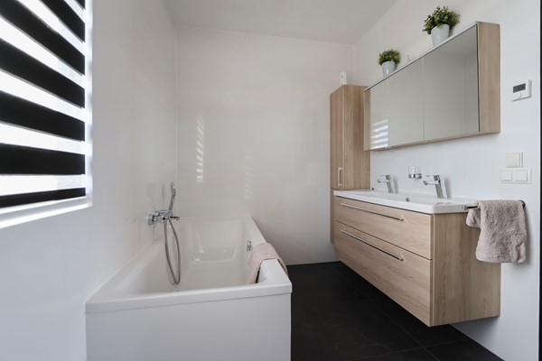 De eerste verdieping telt vier ruime slaapkamers, allemaal voorzien van strak gestuukte wanden, kunststof kozijnen met HR++ glas en een mooie houtlook pvc vloer. De moderne badkamer op deze verdieping is uitgevoerd in antraciet en lichte tinten en beschikt over een wandcloset, inloopdouche, ligbad en dubbel wastafelmeubel.