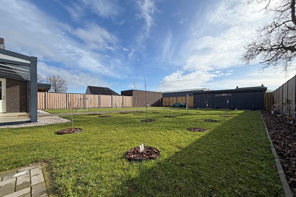 De achtertuin is royaal en grotendeels voorzien van gras, met een looppad naar de achterzijde van het perceel. Hier staat een houten schuur met extra opslagruimte en een elektrische rolpoort, ideaal voor het stallen van fietsen, tuinspullen of grotere items. De tuin beschikt uiteraard over een achterom.