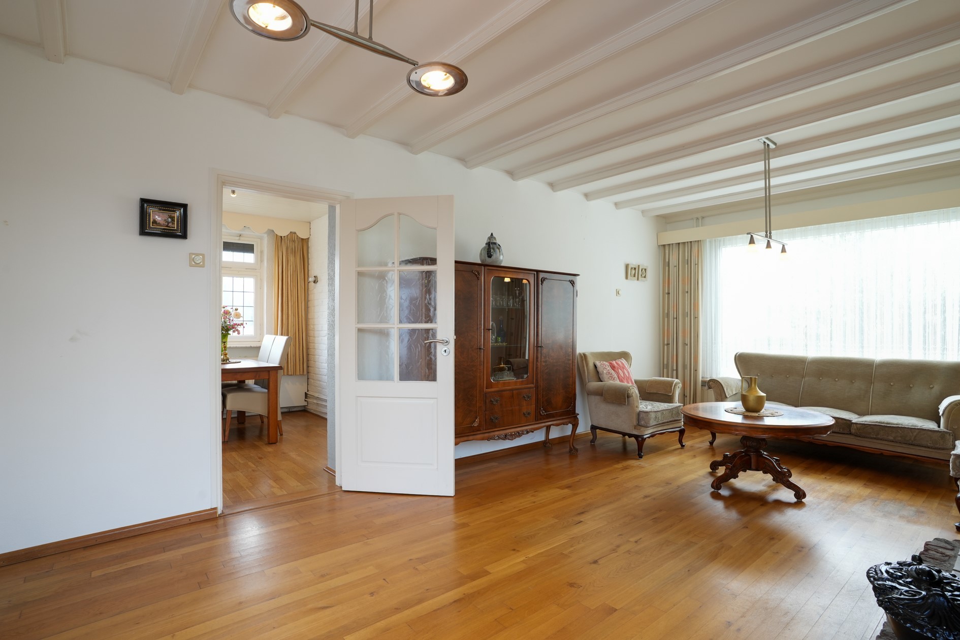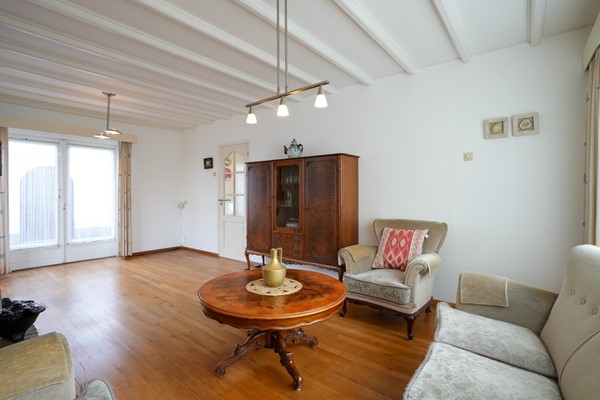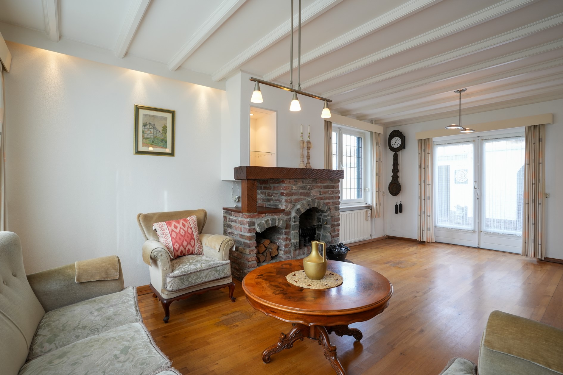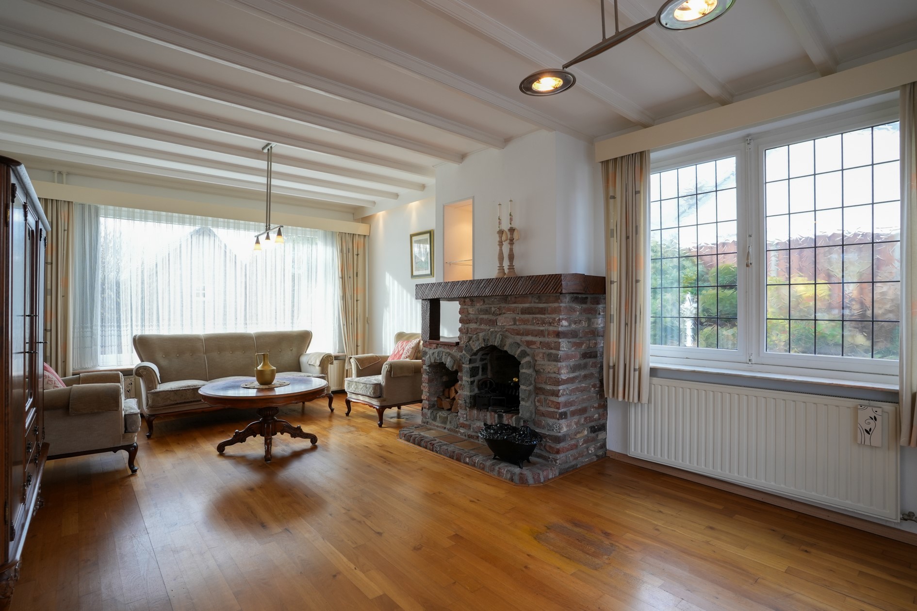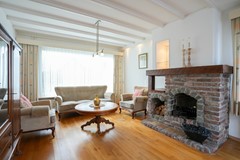 Woonkamer voorzien van schouw met open haard, dubbele tuindeuren en parketvloer