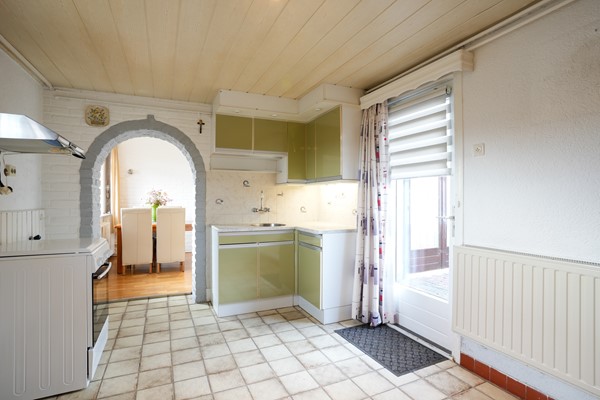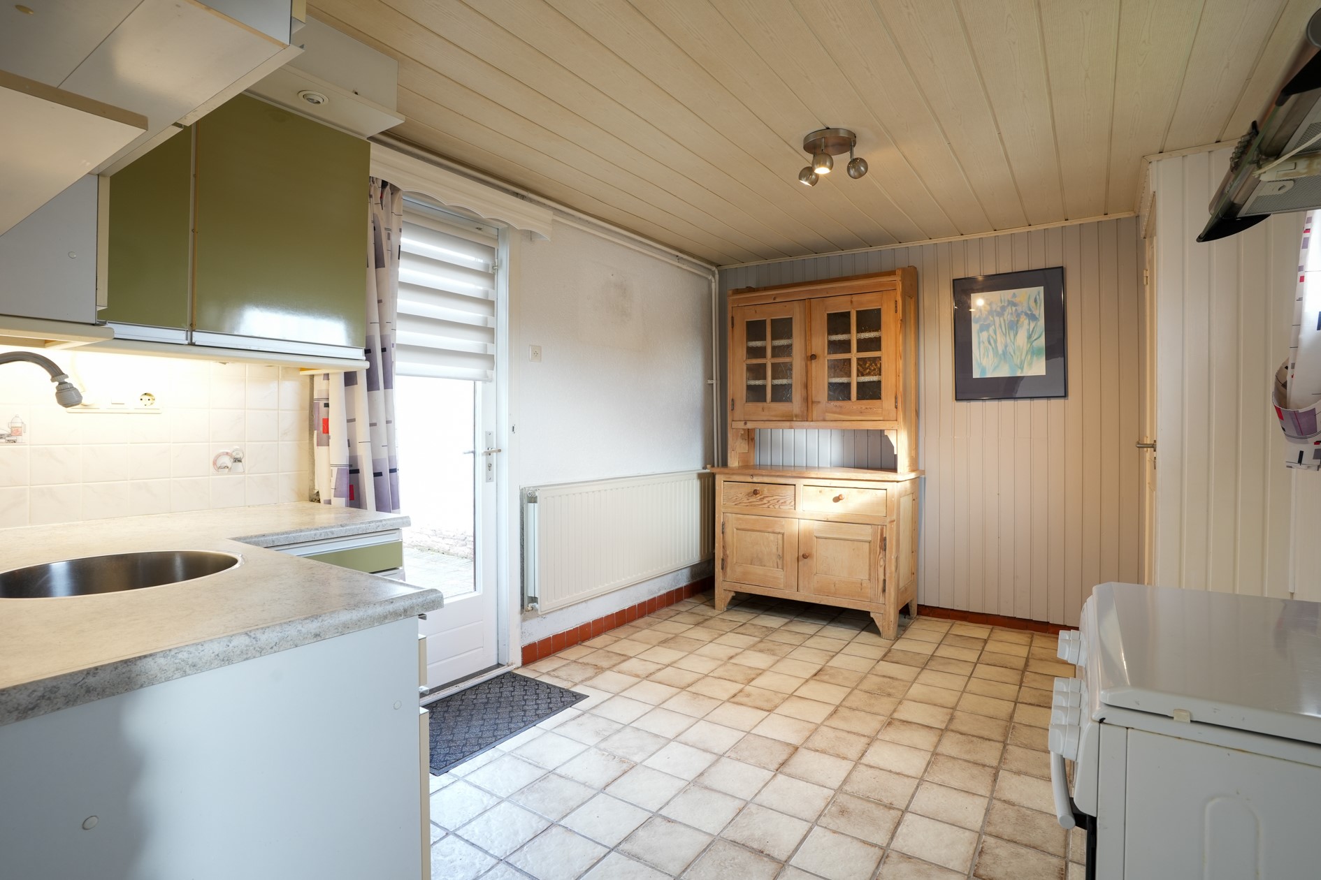 Keuken voorzien van aanrechtblok, muurkast, enkele deur naar de tuin, plavuizenvloer