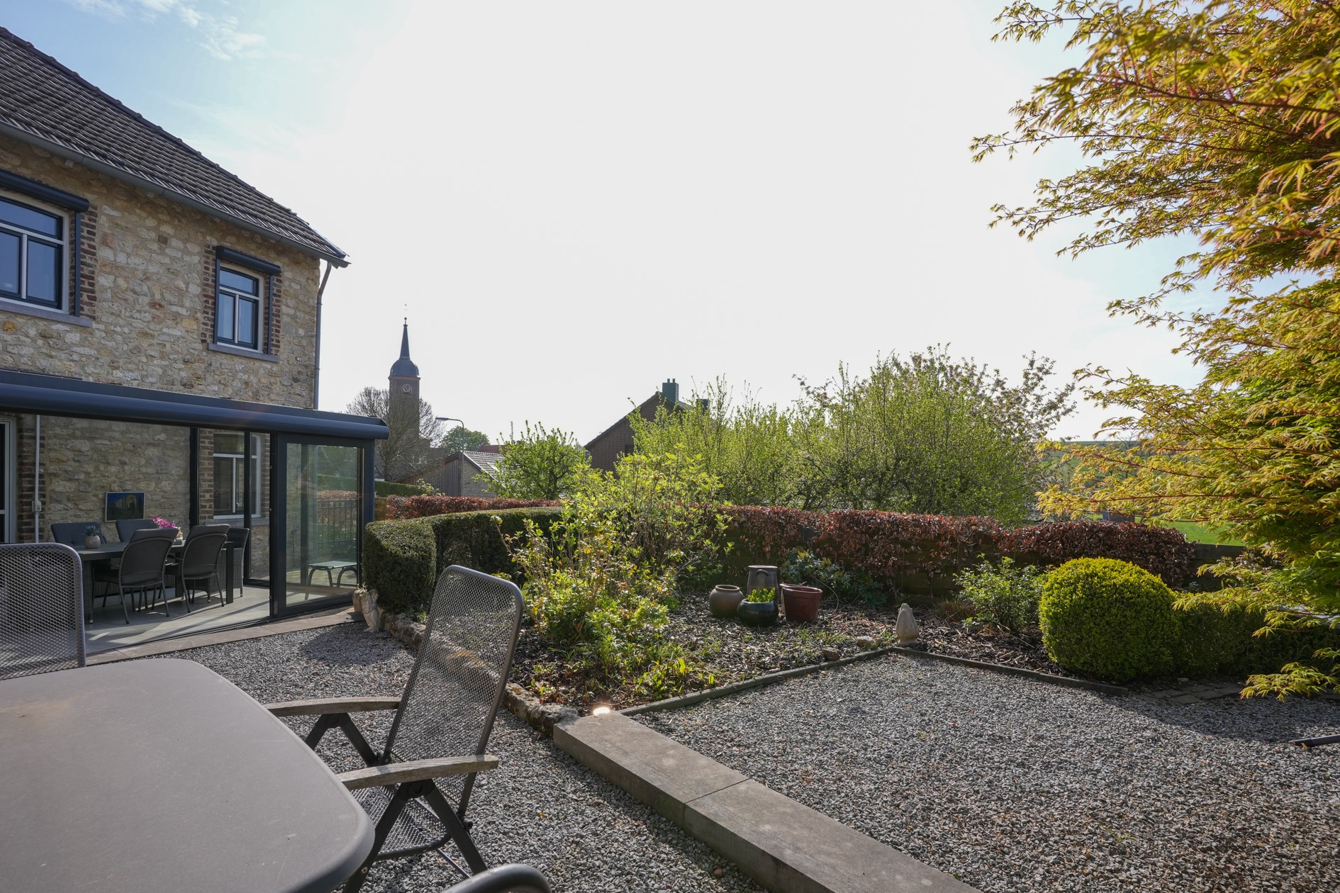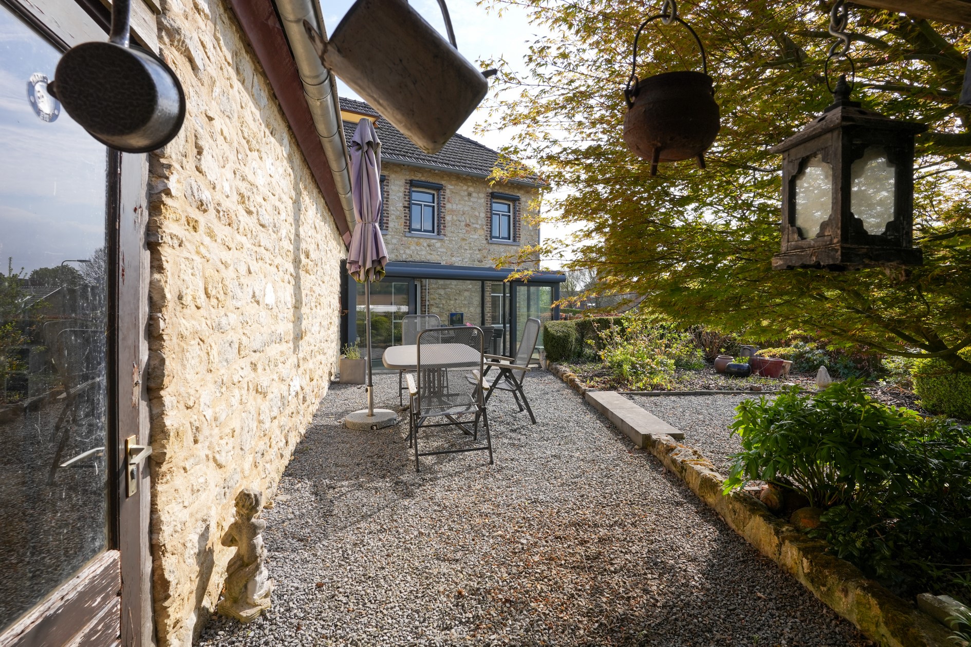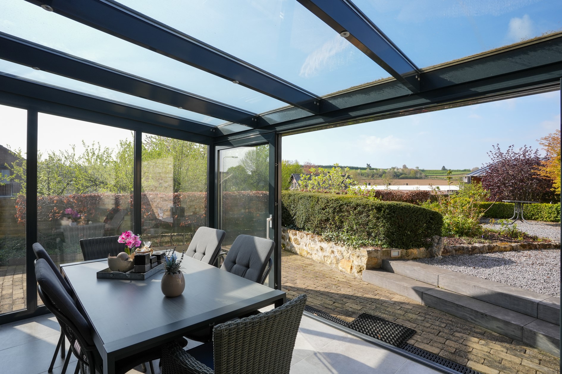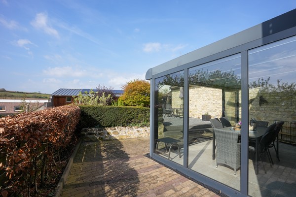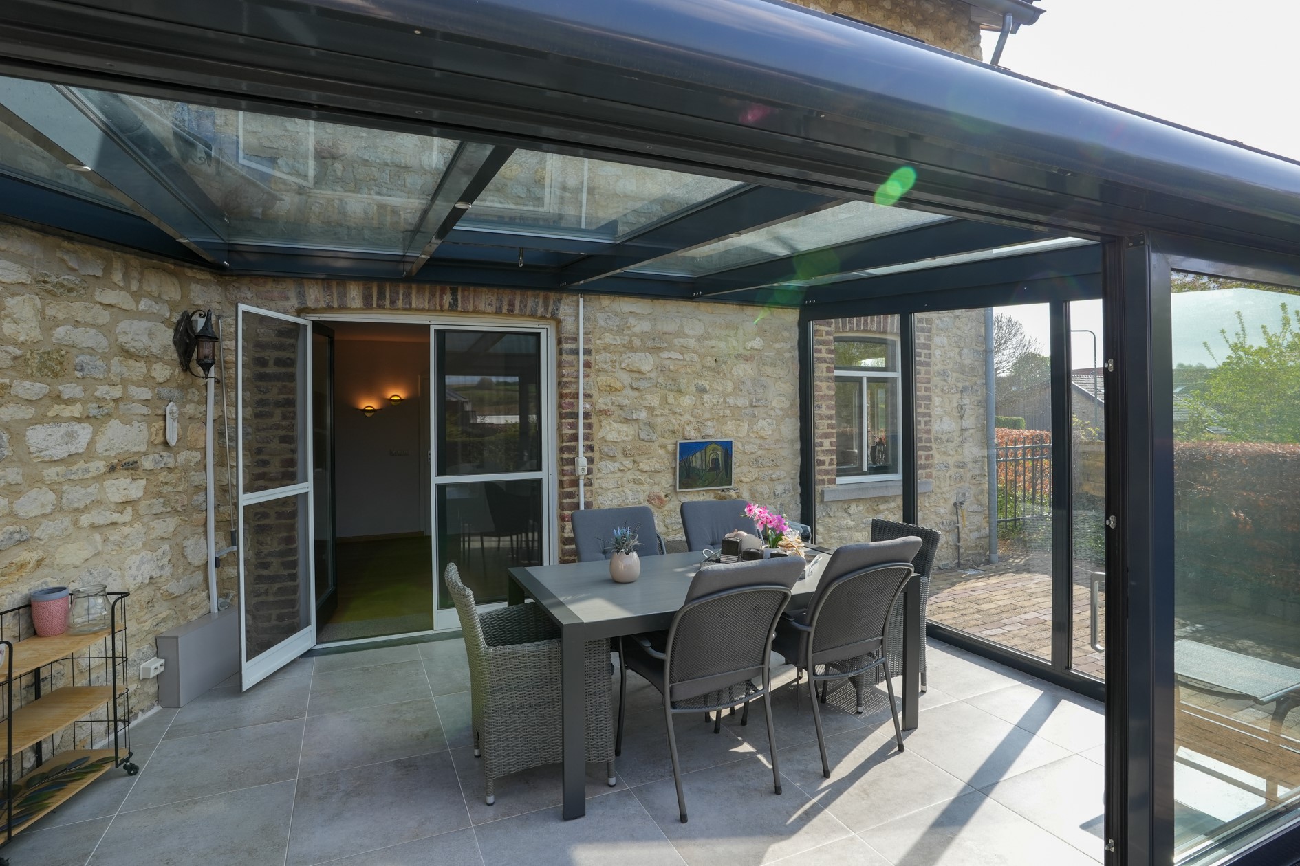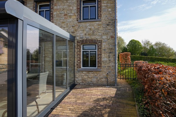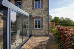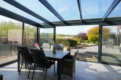 Serre met dubbele schuifpui naar de tuin, betegelde vloer