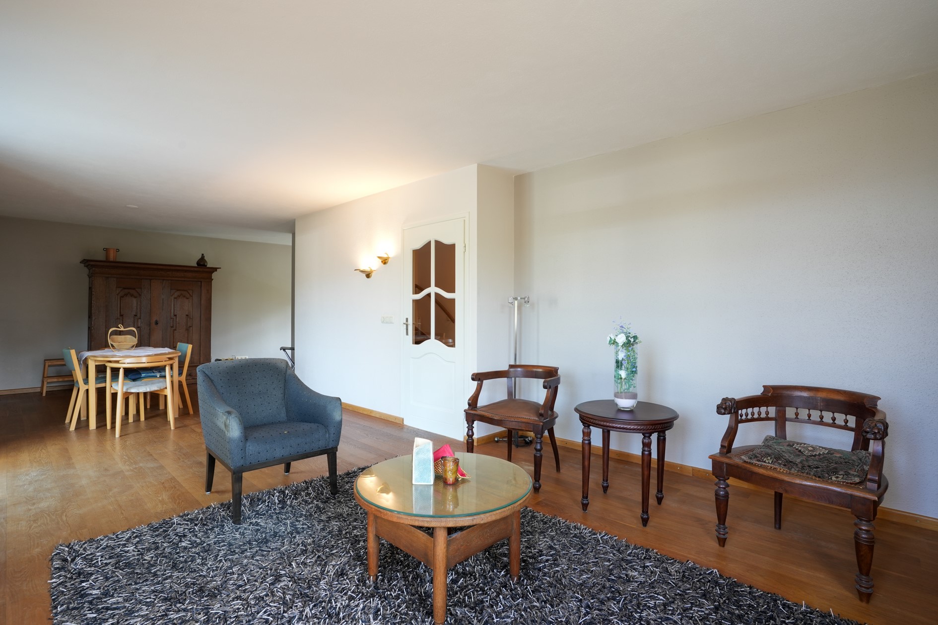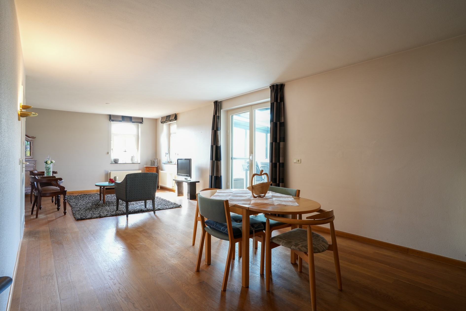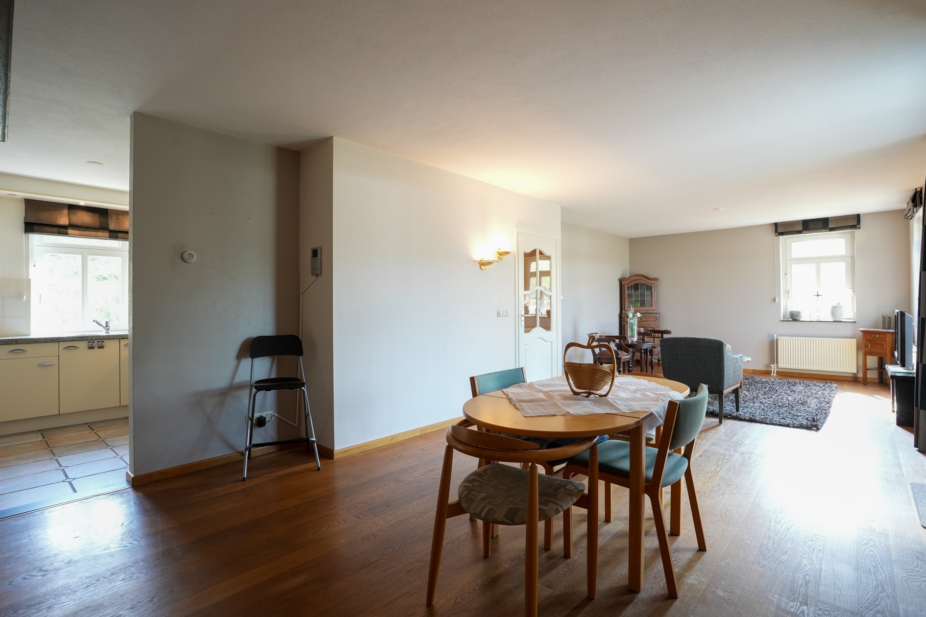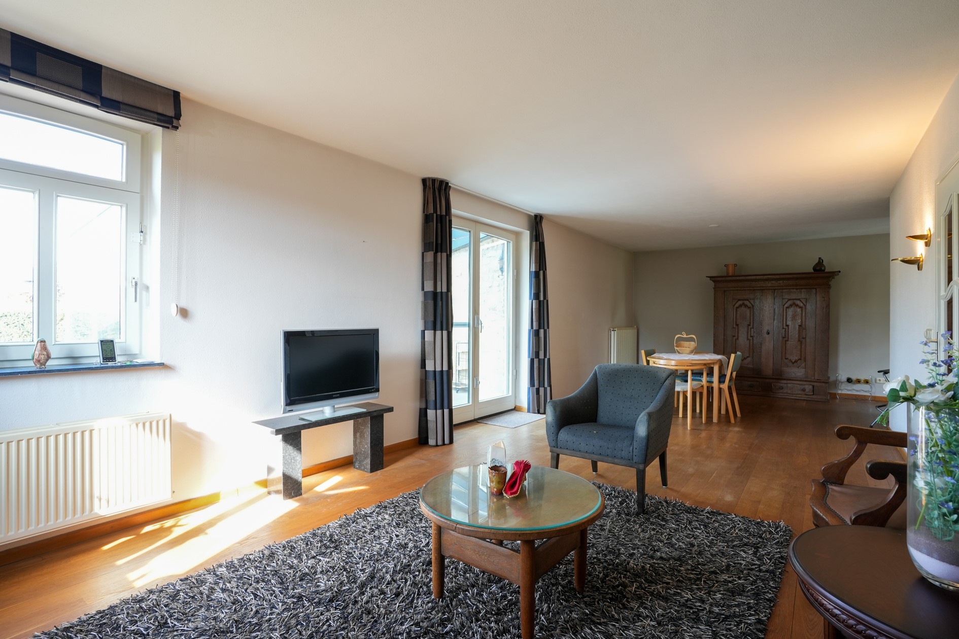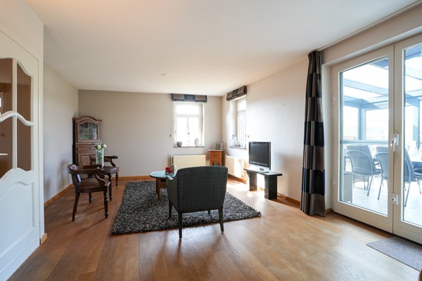 Woonkamer voorzien van eetgedeelte en zitgedeelte, dubbele tuindeuren, parketvloer