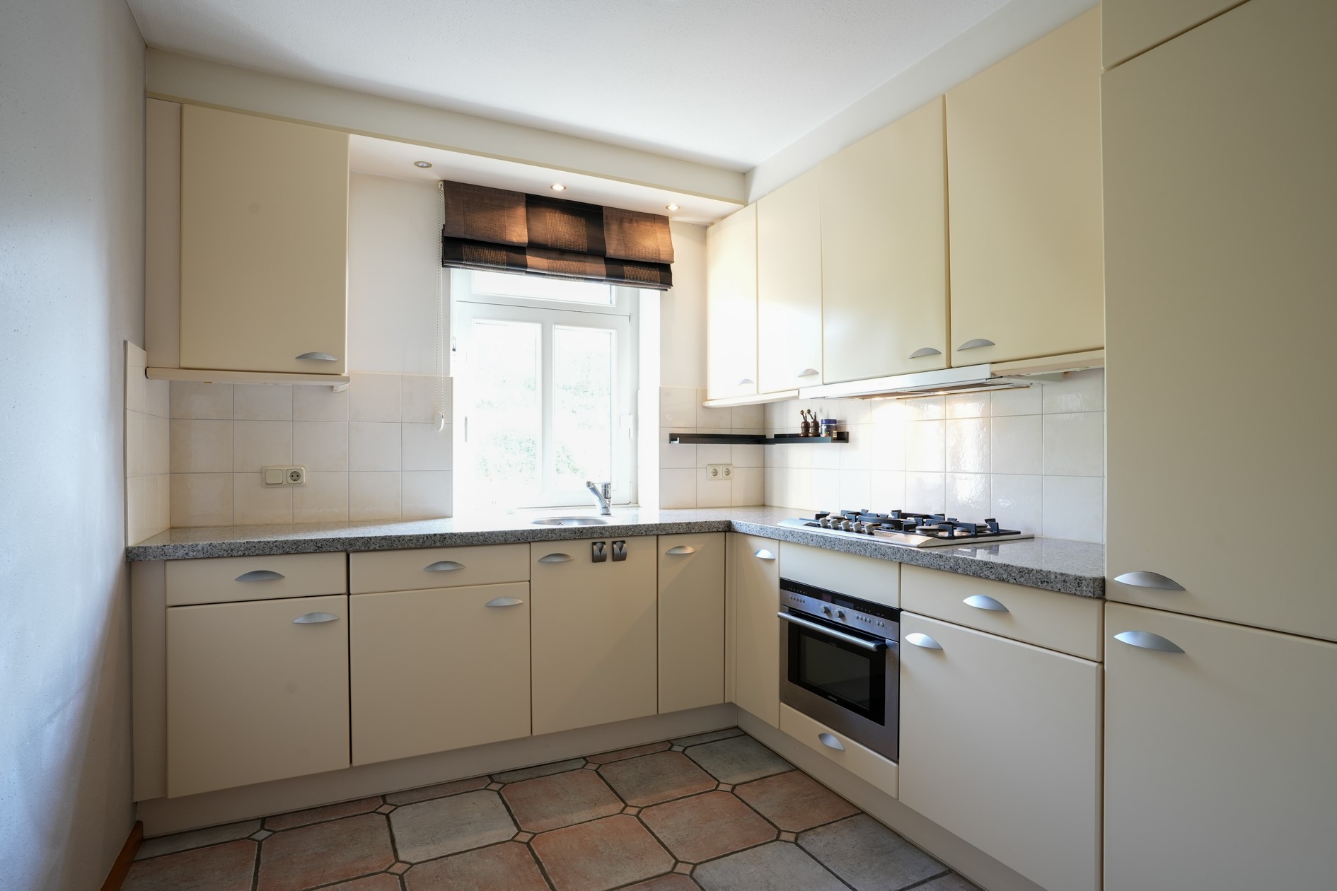 Semi open keuken voorzien van aanbouwinstallatie met de volgende apparatuur: 5 pits gaskookplaat, oven, afzuigkap, koelkast, vaatwasser diepvries