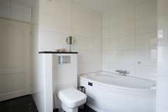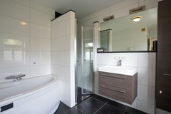 Badkamer voorzien van ligbad, douche, wastafelmeubel en hangend closet