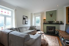 Woonkamer voorzien van eiken parketvloer, schouw met houtkachel en toegang tot balkon