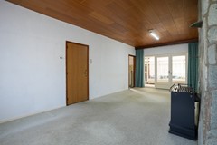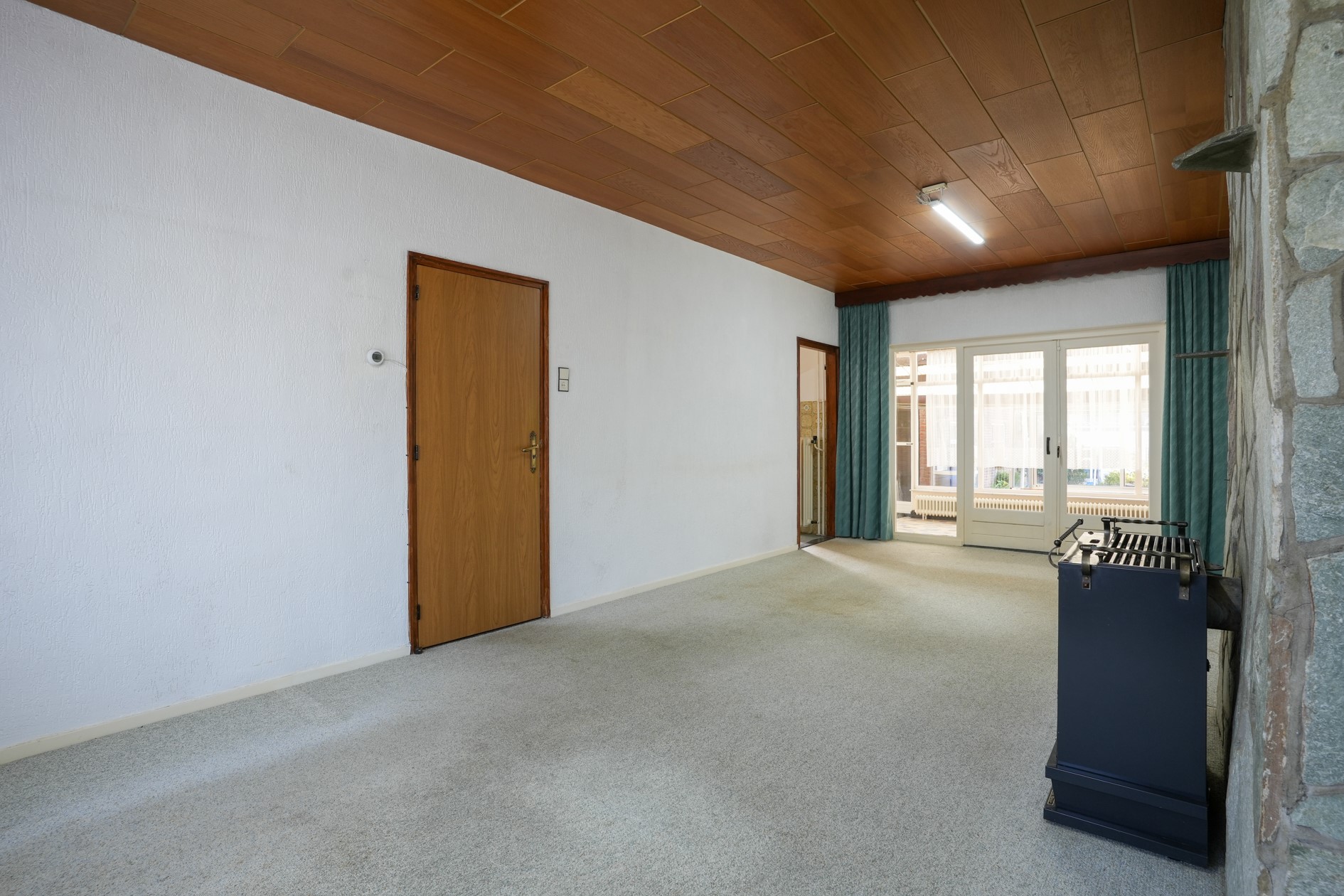 Woonkamer voorzien van vloerbedekking en allesbrander kachel, dubbele deuren naar de serre