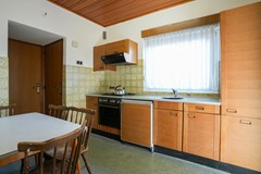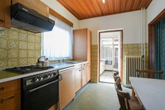 Gesloten keuken voorzien van eenvoudige aanbouwinstallatie met gaskookplaat, oven, afzuigkap en koelkast (defect), muurkast, enkele deur naar de serre