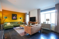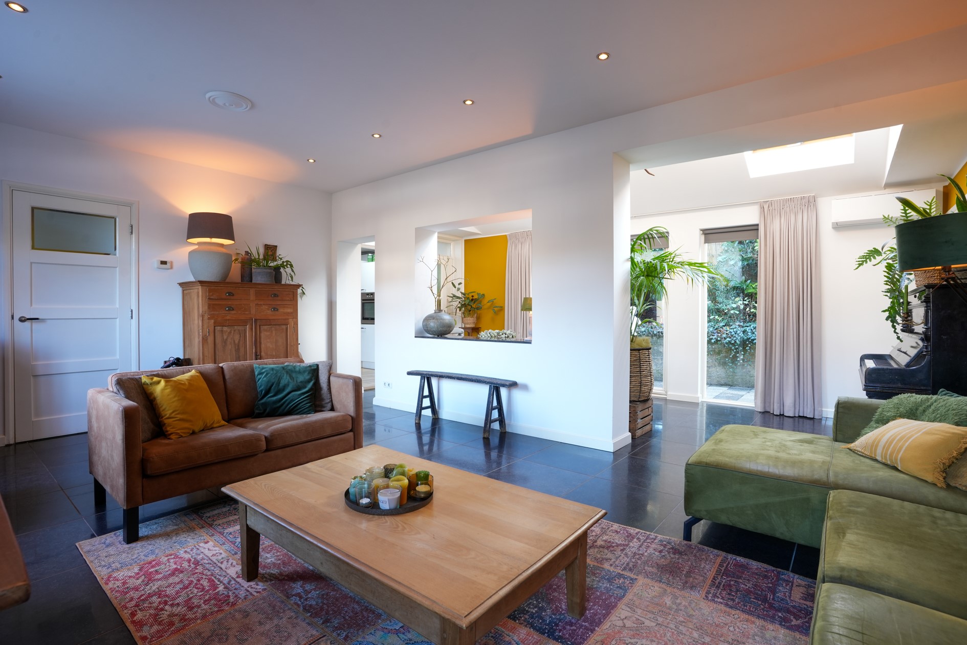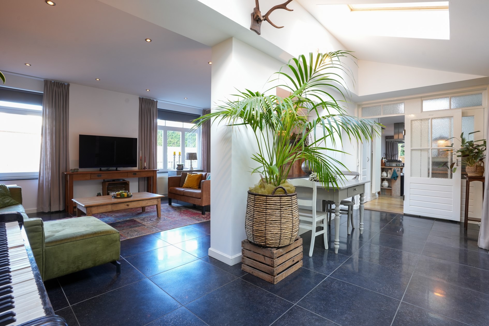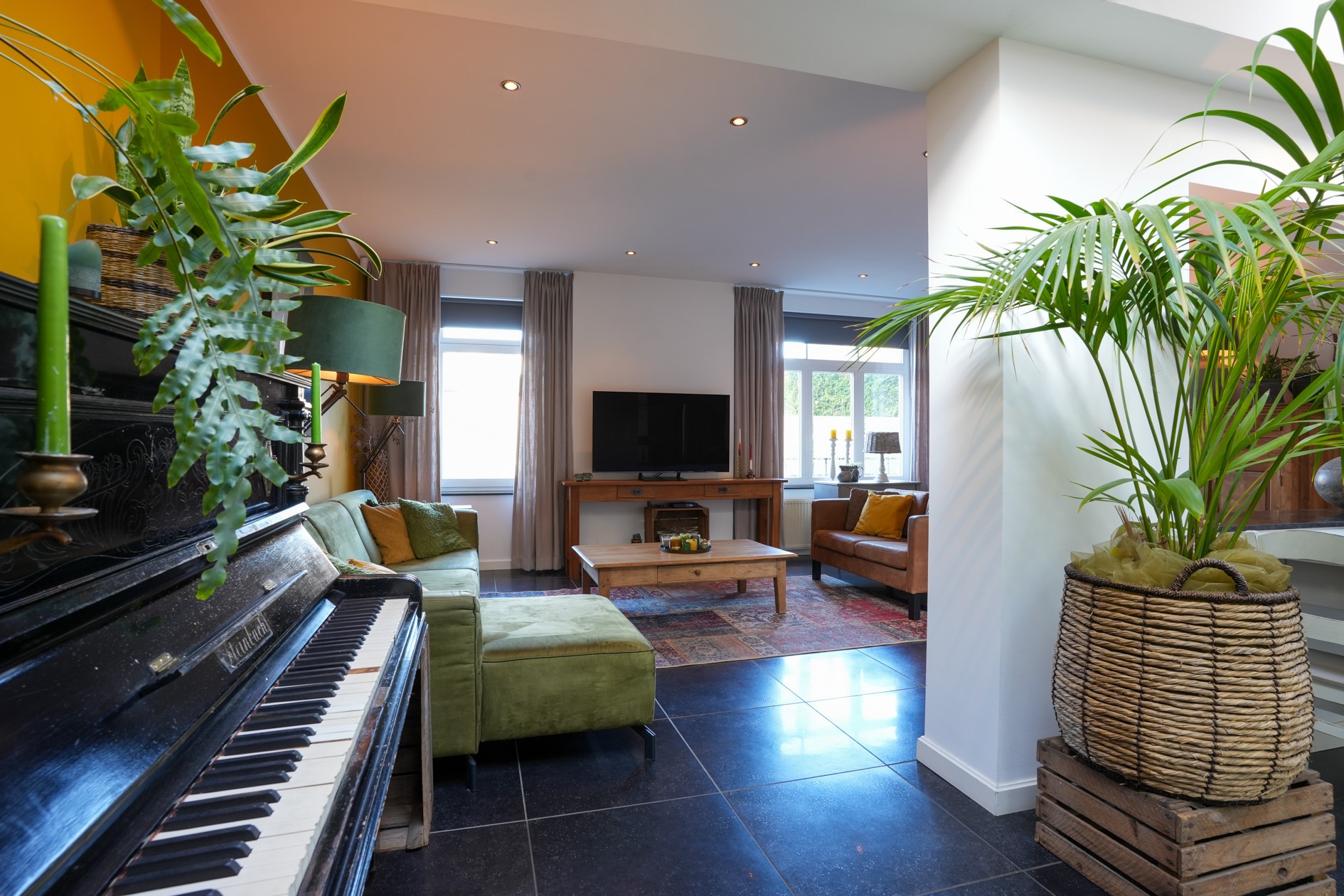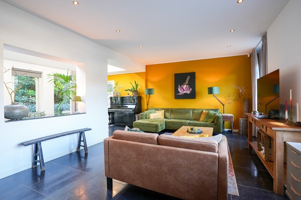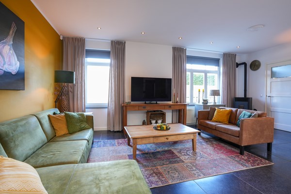 Woonkamer voorzien van plavuizenvloer met vloerverwarming, pelletkachel en airconditioning