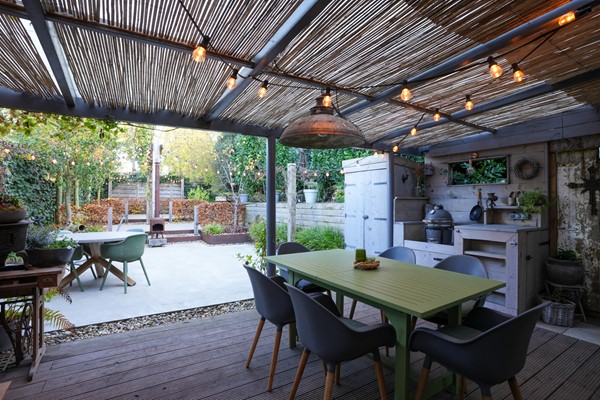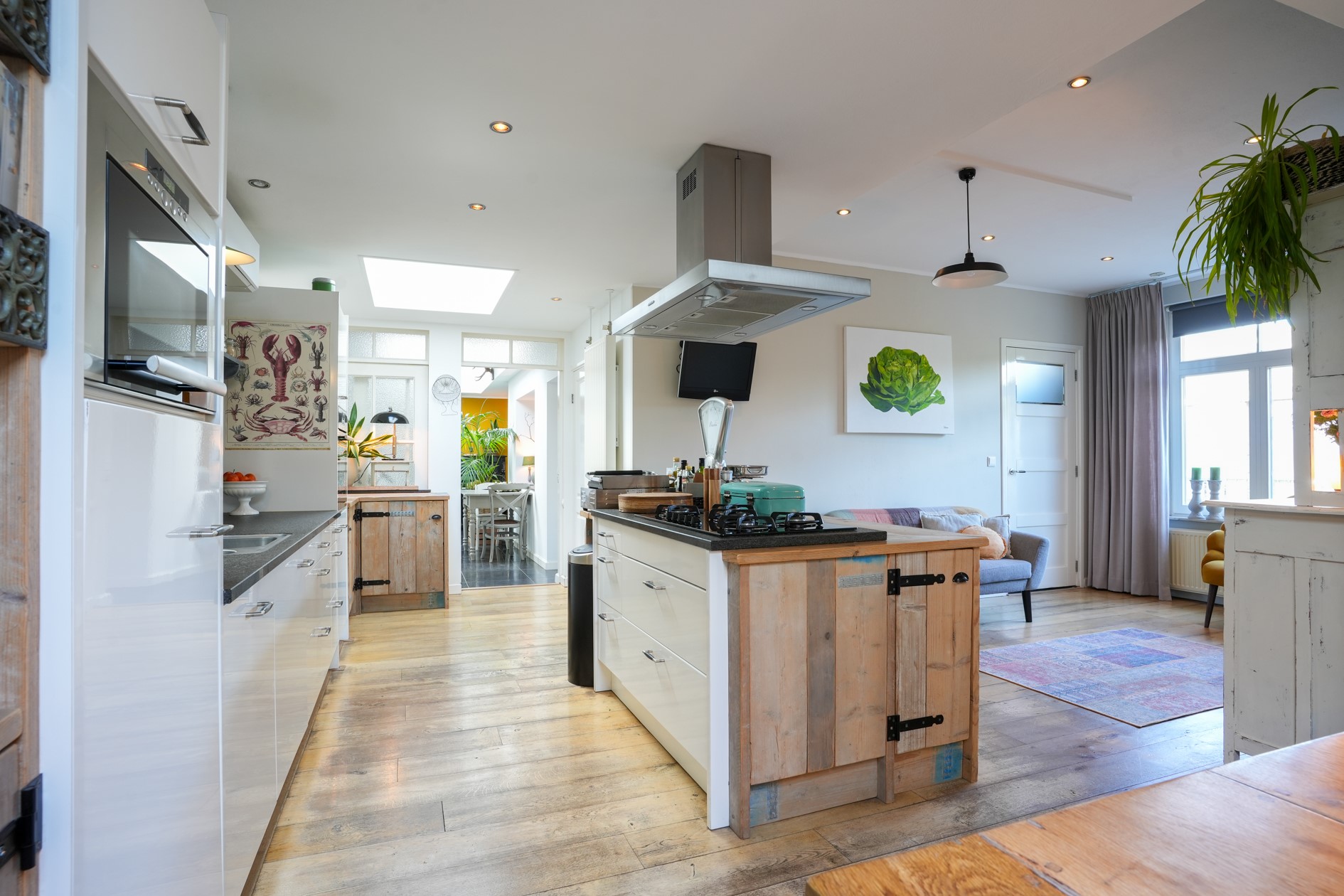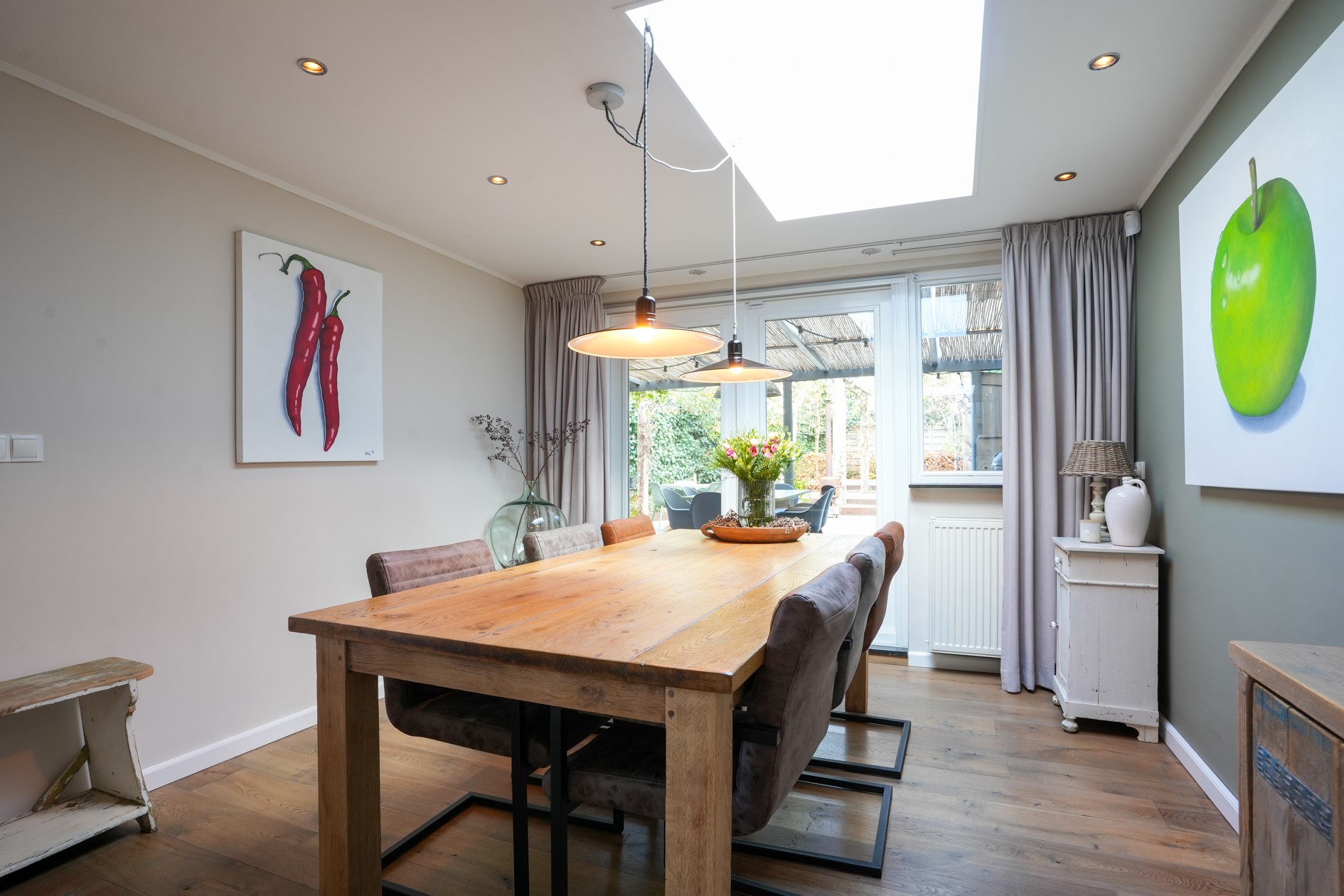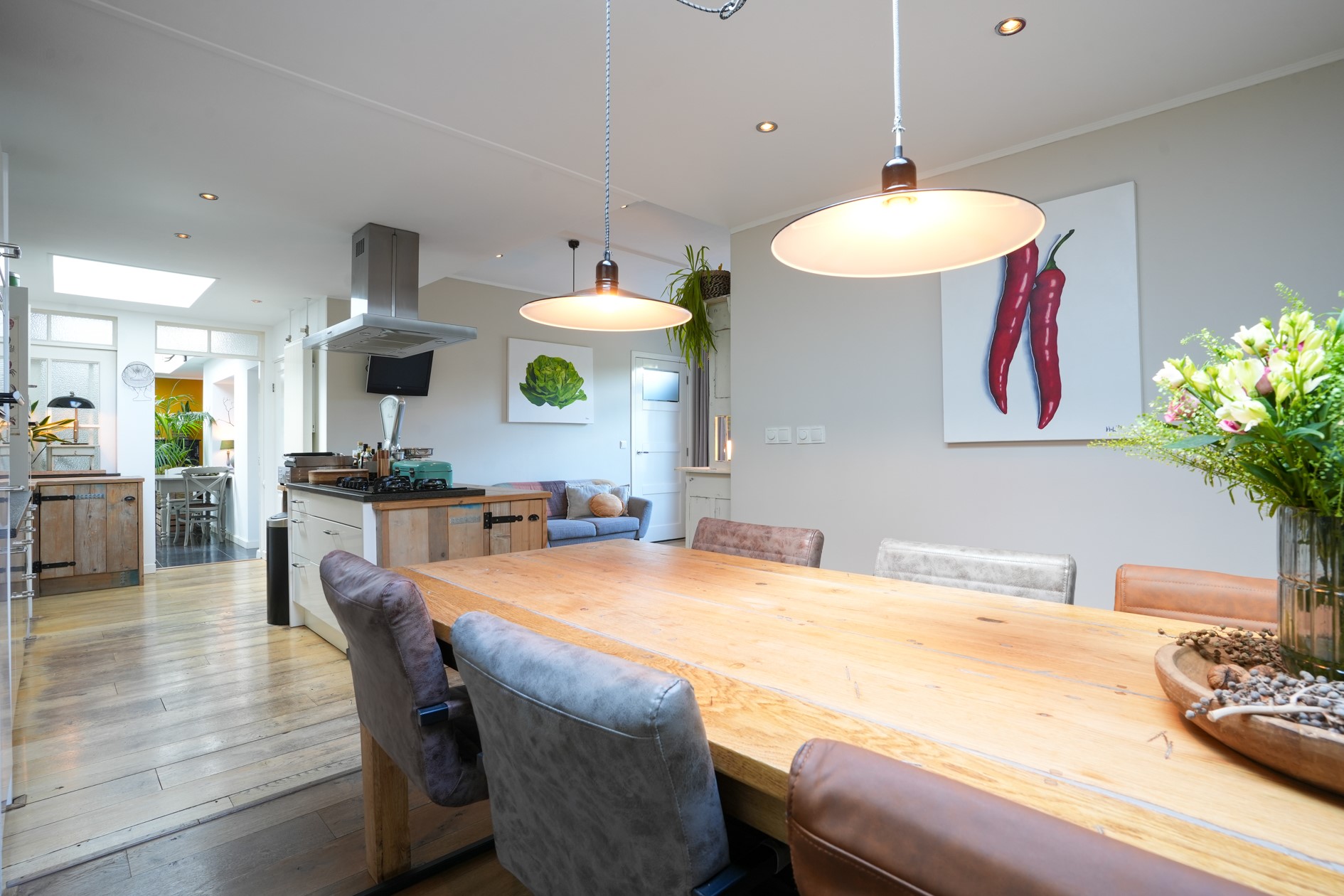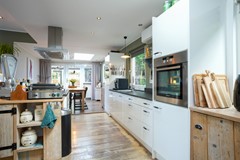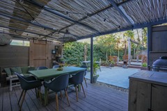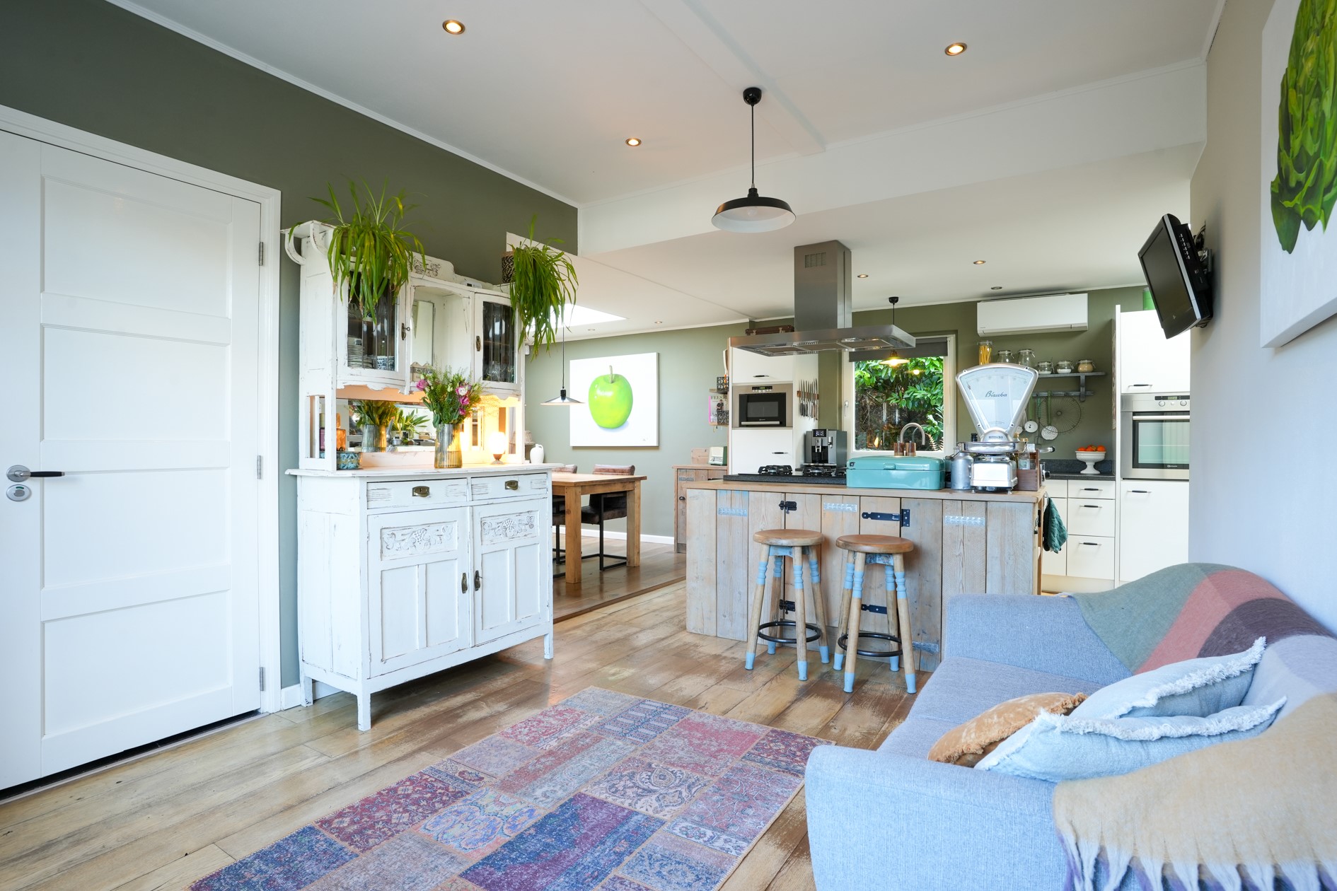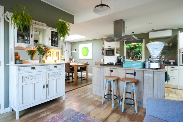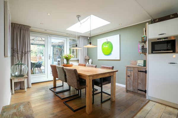 Woonkeuken met zit-, eet- en kookgedeelte, voorzien van eiken parketvloer, pelletkachel, airconditioning en dubbele deuren naar de tuin. Kookeiland met 5 pits gaskookplaat, RVS afzuigkap, oven, magnetron, vaatwasser, koelkast kokend waterkraan.