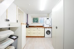 Bijkeuken met aanrechtblok, witgoedaansluiting en toegang naar de garage en bergzolder