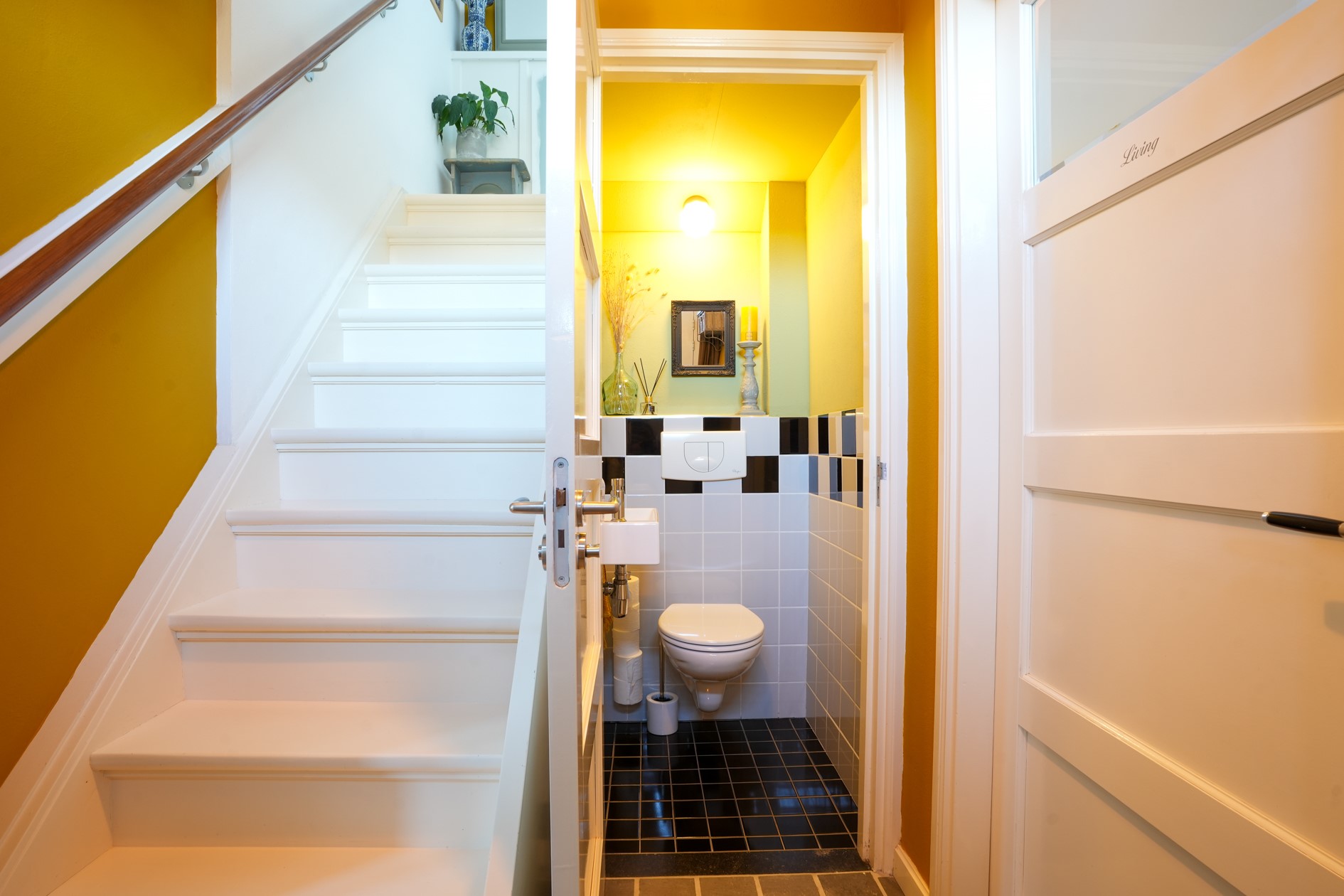 Toilet voorzien van hangend closet en fontein, halfhoog betegeld