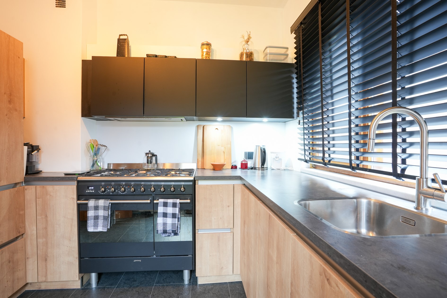Gesloten keuken voorzien van tegellaminaatvloer en enkele deur naar de tuin, aanbouwinstallatie met de volgende apparatuur: Smeg 6 pits gasfornuis met dubbele oven, afzuigkap, koelkast en vaatwasser