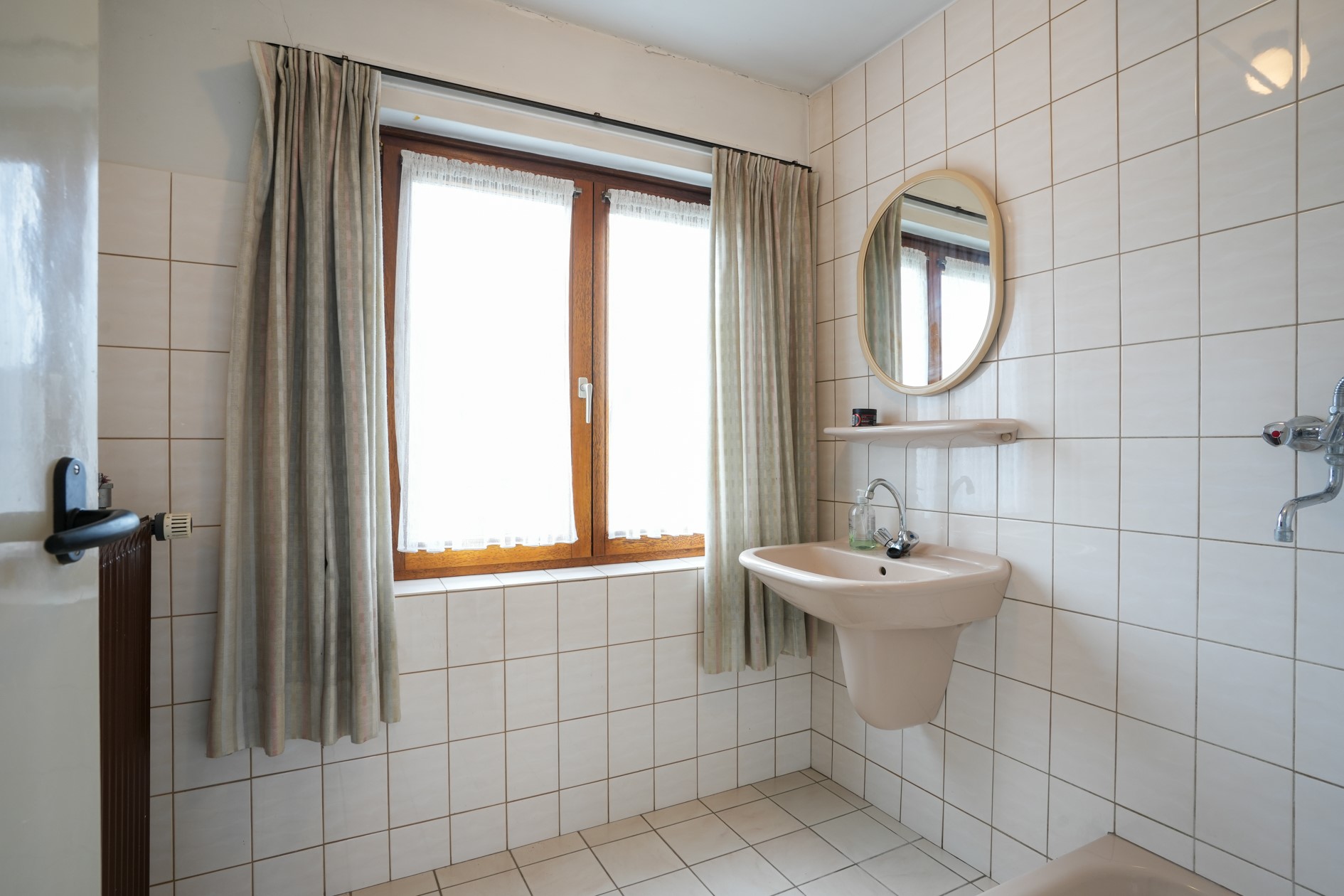 Badkamer voorzien van wastafel en douche, 3/4 deel betegeld