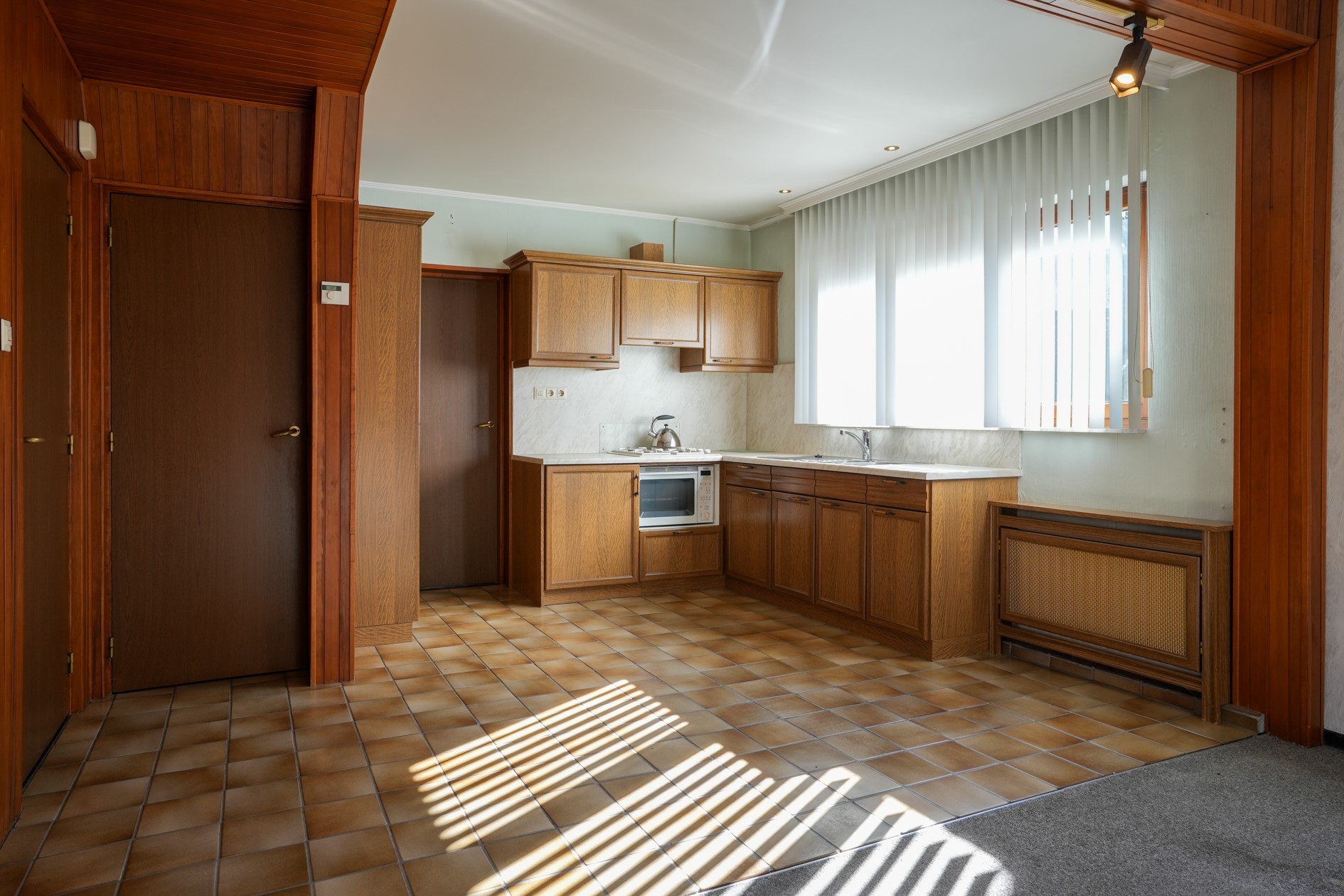 Open keuken voorzien van tegelvloer, aanbouwinstallatie met gaskookplaat, afzuigkap, magnetron en koelkast