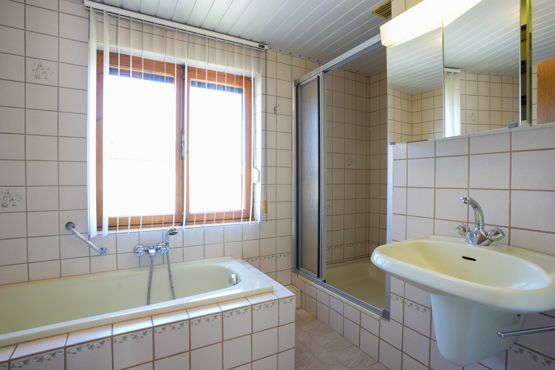 Badkamer met ligbad, douche, wastafel en hangend toilet
