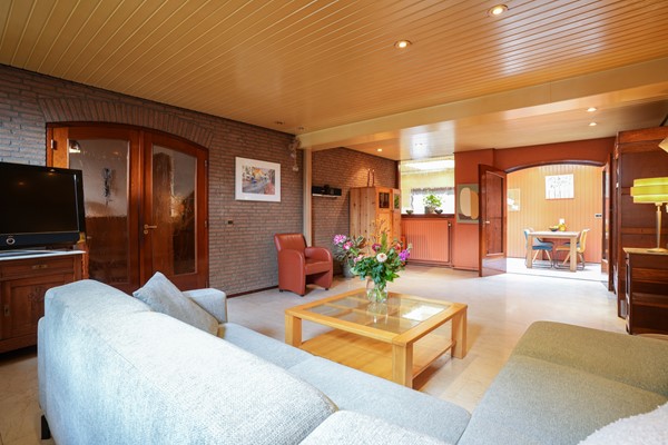 Woonkamer voorzien van travertinvloer, dubbele deuren naar de keuken