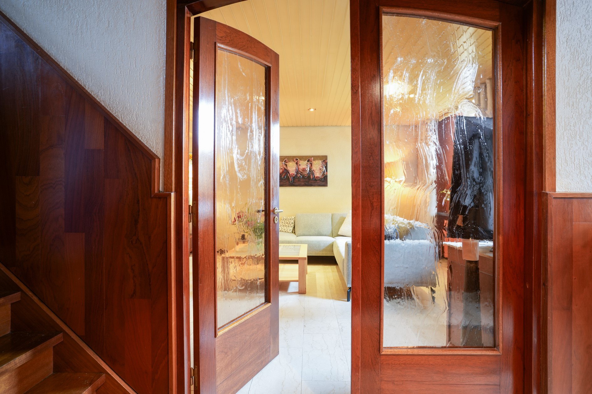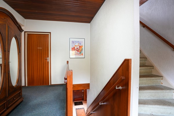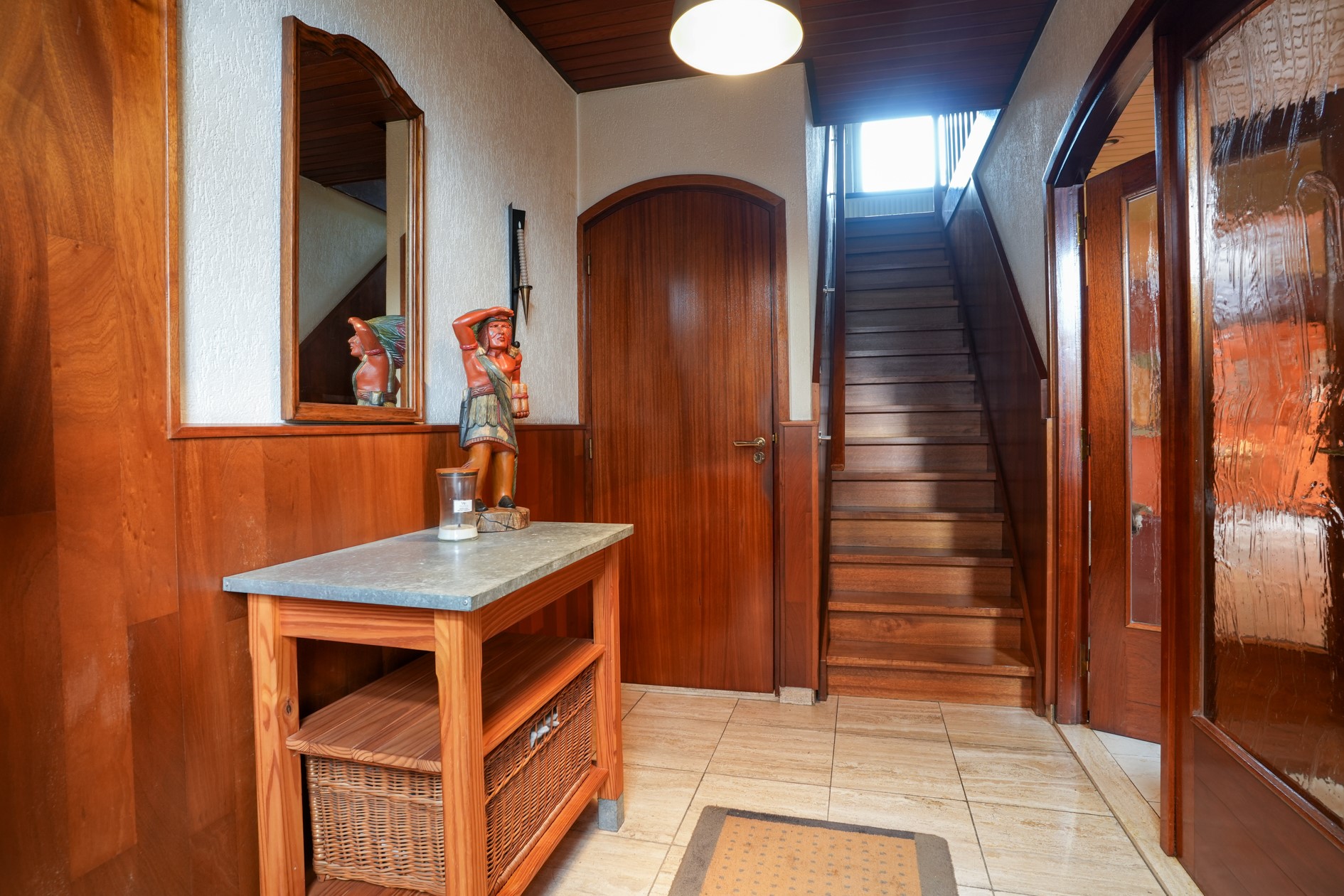 Entree, hal met travertinvloer en trapopgang, dubbele deuren