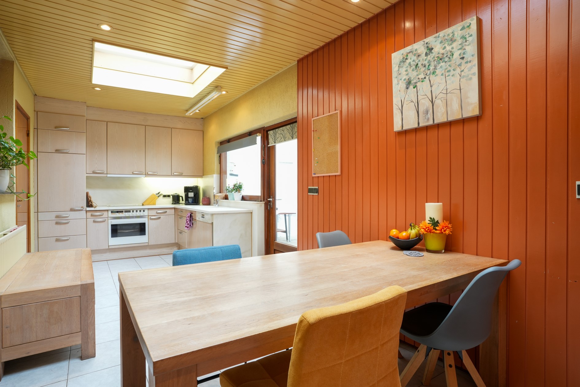 Gesloten keuken voorzien van tegelvloer, aanbouwinstallatie met keramische kookplaat, afzuigkap, oven, vaatwasser en koelkast. Enkele deur naar de terrasoverkapping