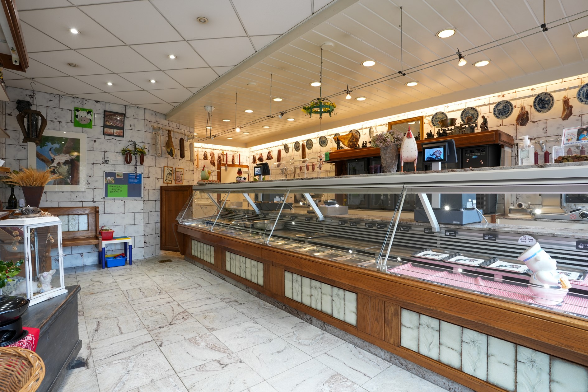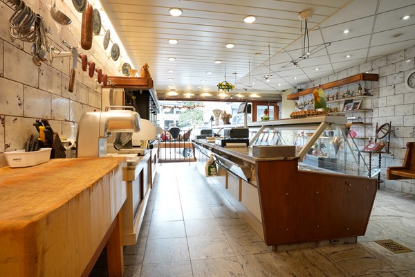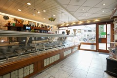 Winkel/bedrijfsruimte met toonbank met koelvitrine, plavuizenvloer, winkelpui met enkele deur