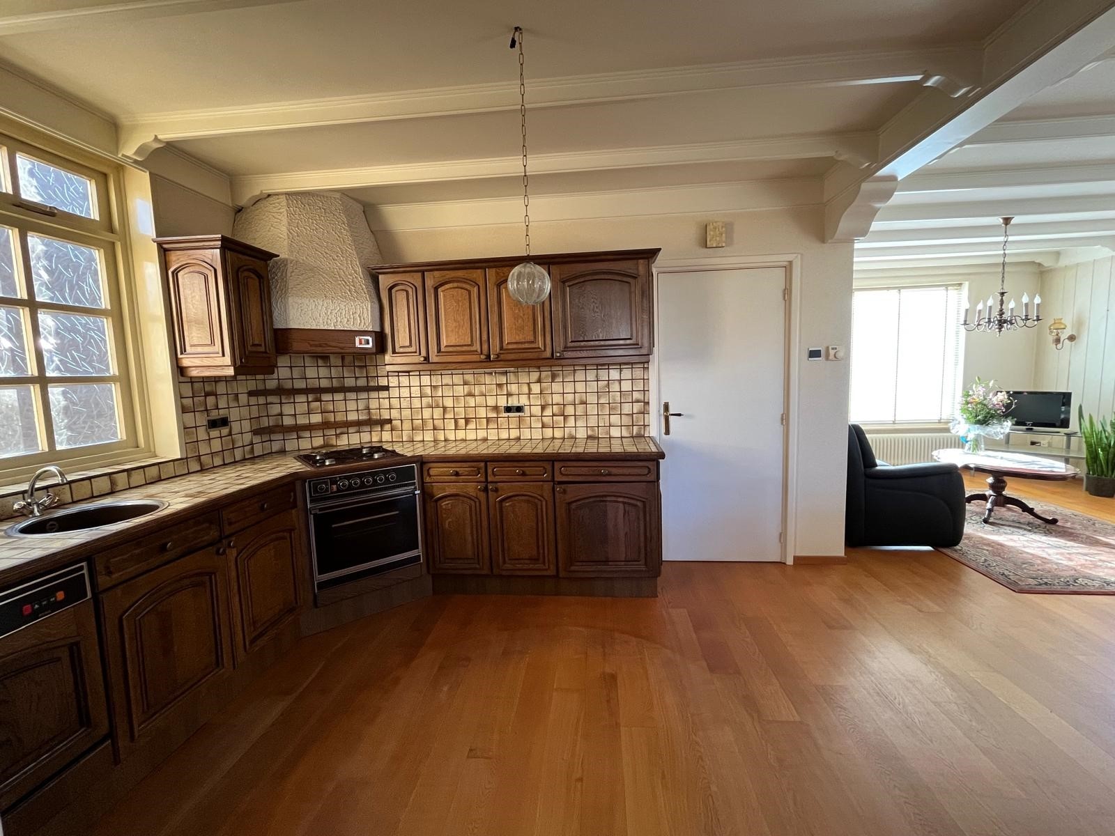 Er is doorgang naar de woonkamer met een volledig doorgelegde eiken parketvloer. Tevens doorgang naar de keuken en de badkamer.