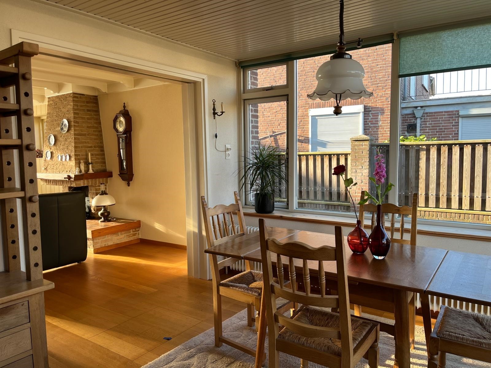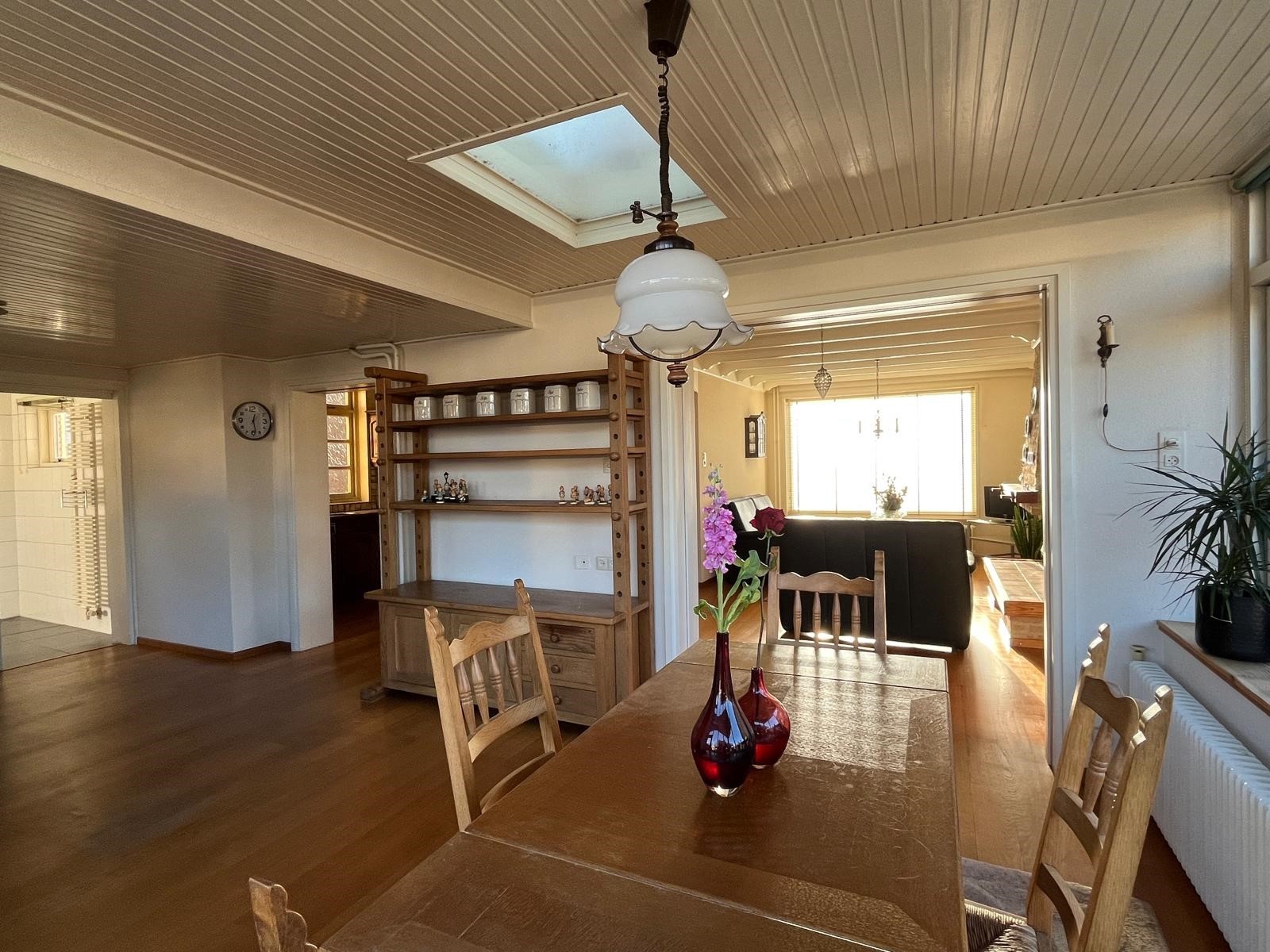 De woonkamer is opgezet met ruimte voor de eettafel en zithoek met een doorlopende eiken parketvloer.