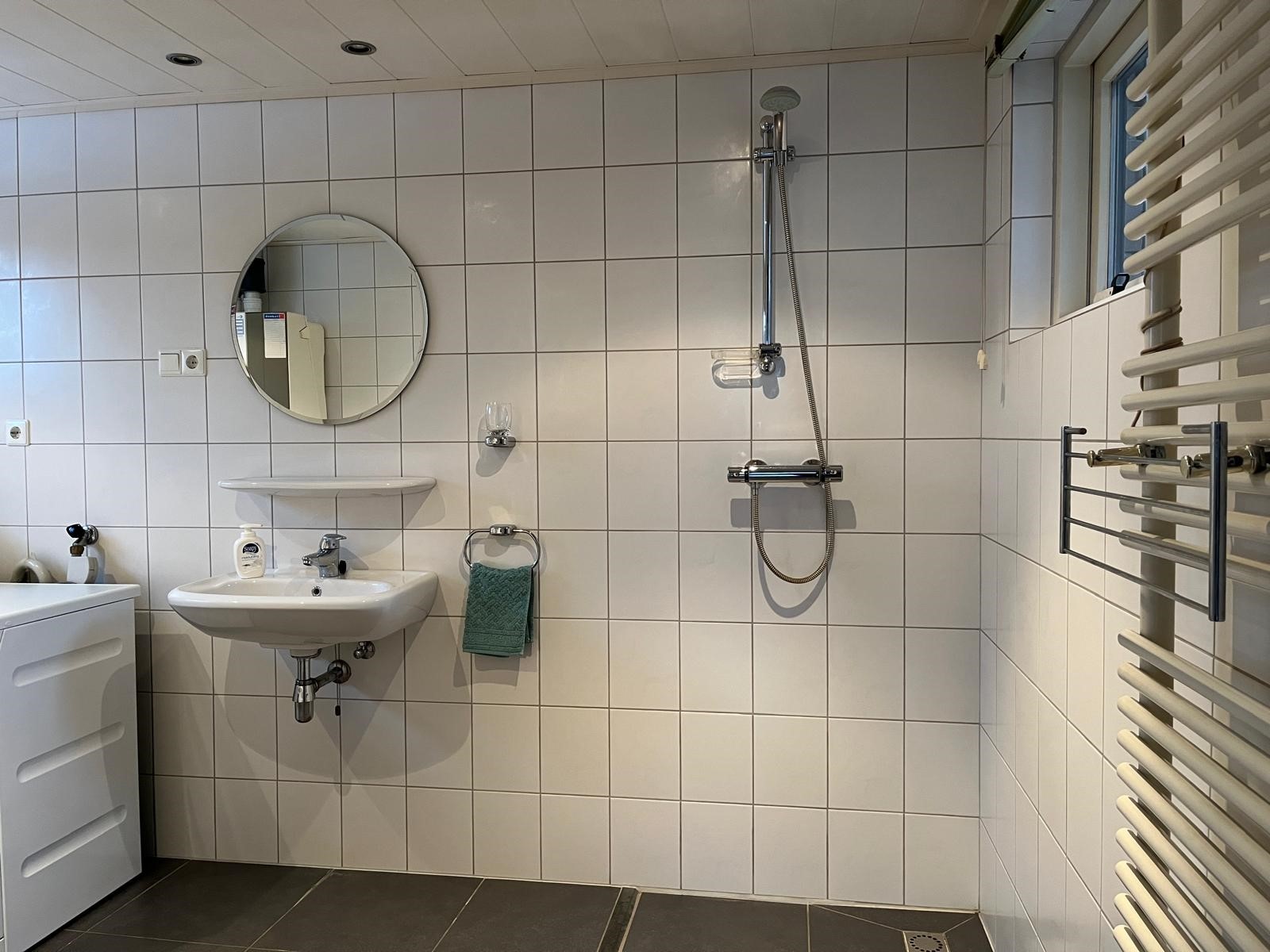 De badkamer is geheel open opgezet met douche en wastafel. De wasmachine en droger zijn hier geplaatst. Wel zo handig!