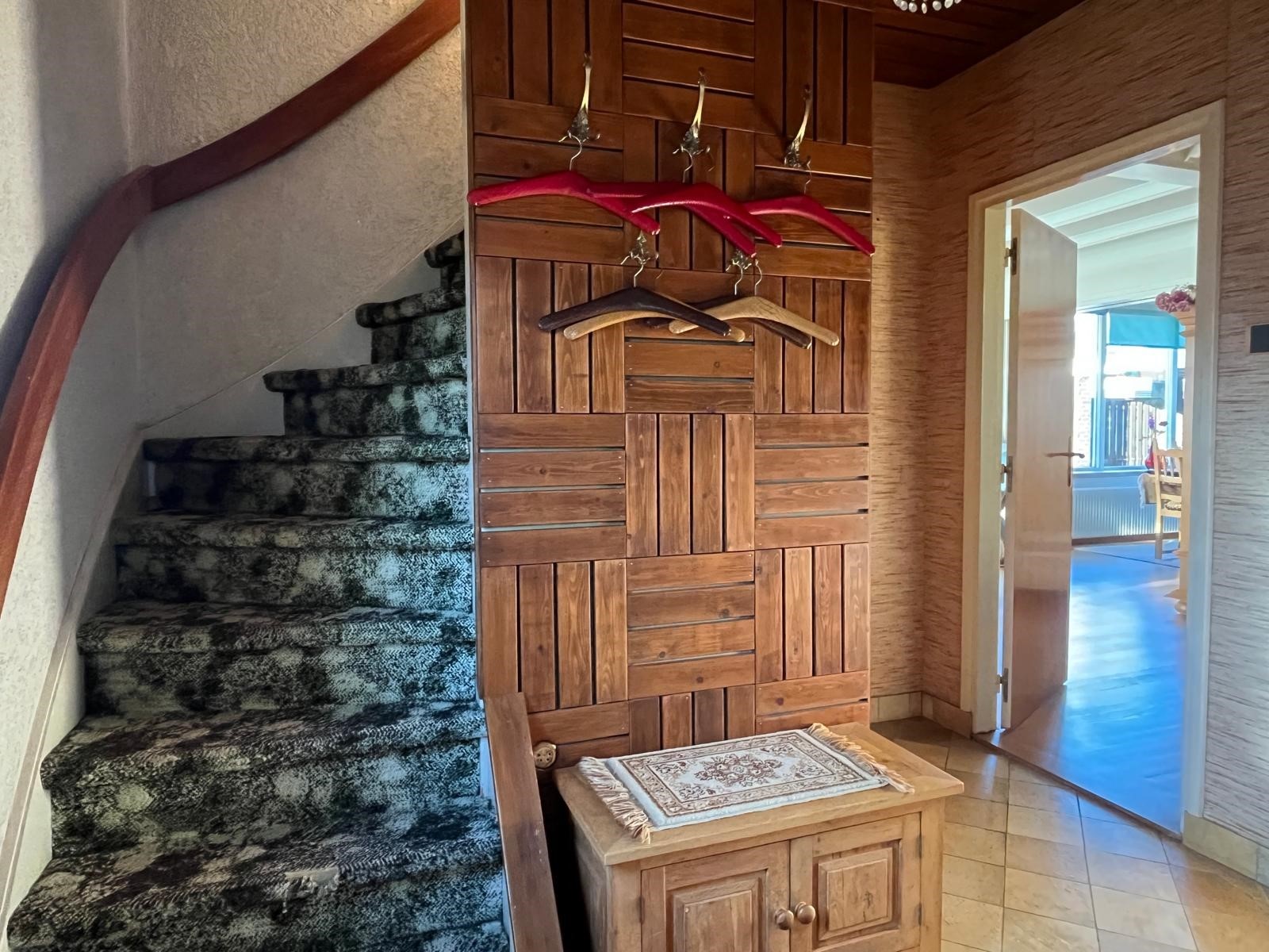 Tevens bevindt zich hier de houten trap naar de verdieping en het toilet.