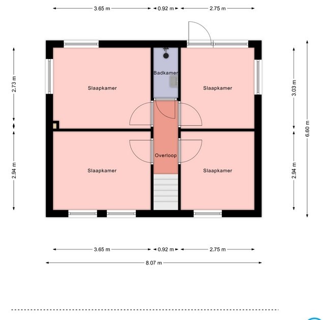 De slaapkamers zijn via de overloop te bereiken. Twee slaapkamers zijn voorzien van een inbouwkast.