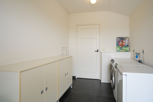 Bijkeuken met witgoedaansluiting en gootsteen, enkele deur naar de tuin