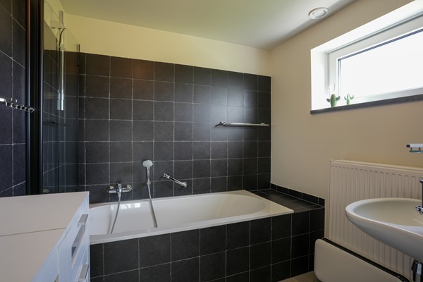Badkamer voorzien van ligbad/douche combinatie en wastafel