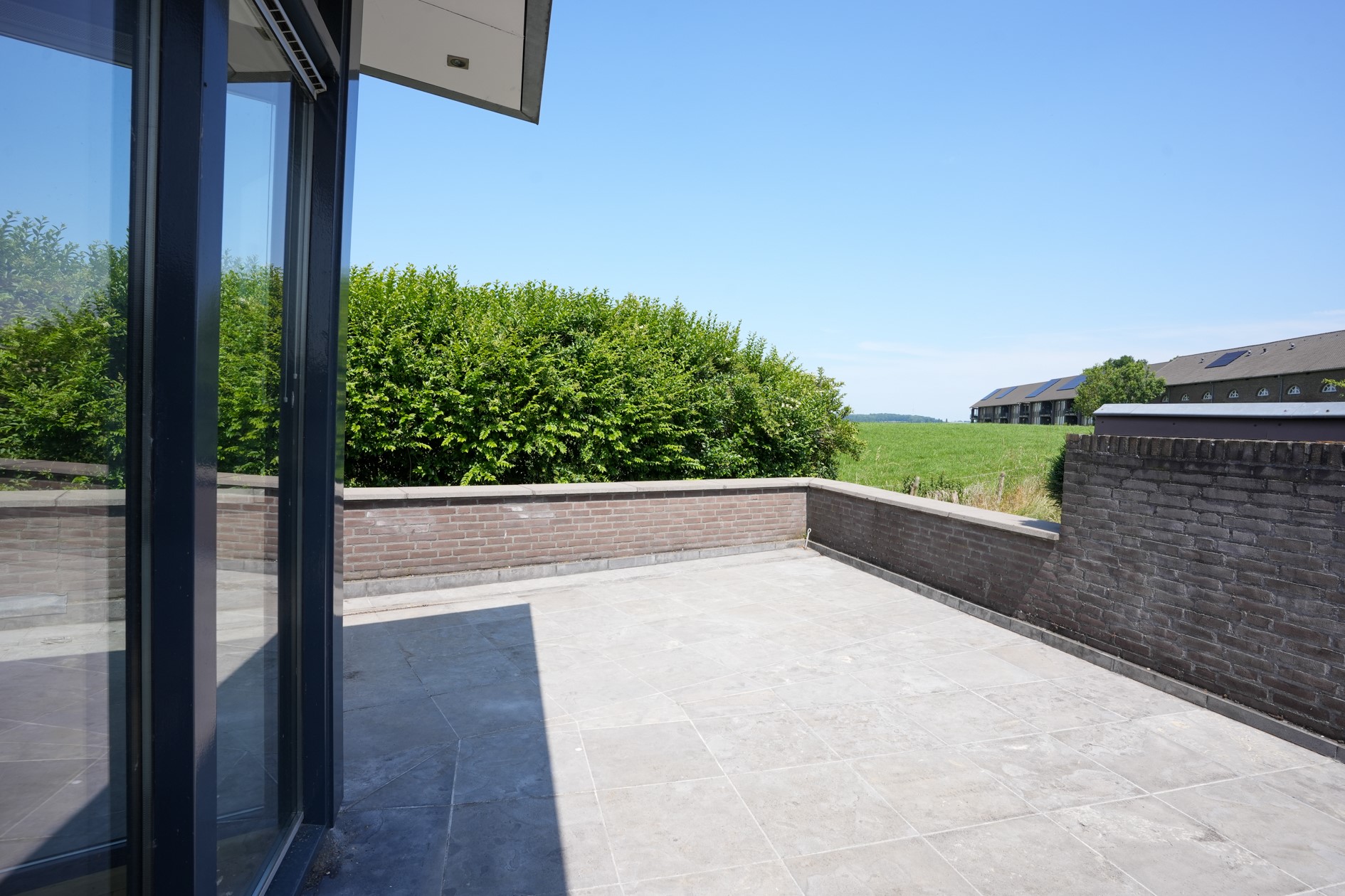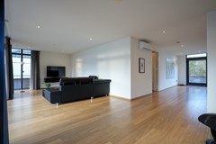 Woonkamer met dubbele schuifpui naar het deels overdekte terras