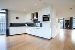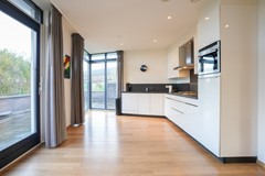 Semi open keuken met schuifpui naar het terras, de keuken is voorzien van aanbouwinstallatie met de volgende apparatuur: 5 pits gaskookplaat, RVS afzuigkap, combi oven, koelkast en vaatwasser