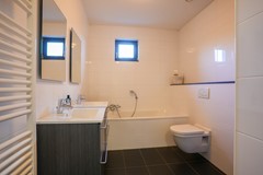 Badkamer voorzien van inloopdouche, ligbad, dubbel wastafelmeubel en hangend closet