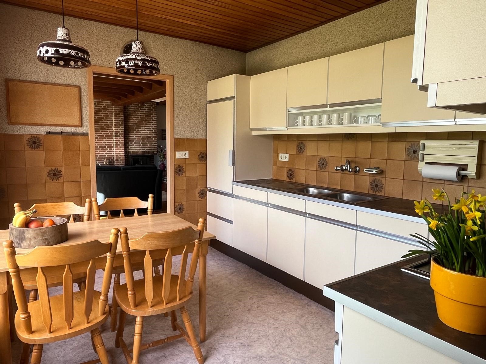 Deze keuken is ingericht met een inbouwkeuken van kunststof en kunststof blad met spoelbak, gaskooktoestel, afzuigkap, en koelkast. Deze keuken is eenvoudig van opzet. Vanuit de keuken is er toegang tot de bijkeuken en een fraai zicht over de tuin.