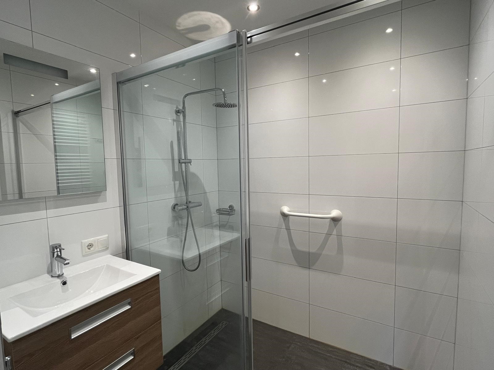 De badkamer is geheel vernieuwd en voorzien van tegelwerk een wastafel met badmeubel en inloopdouche.