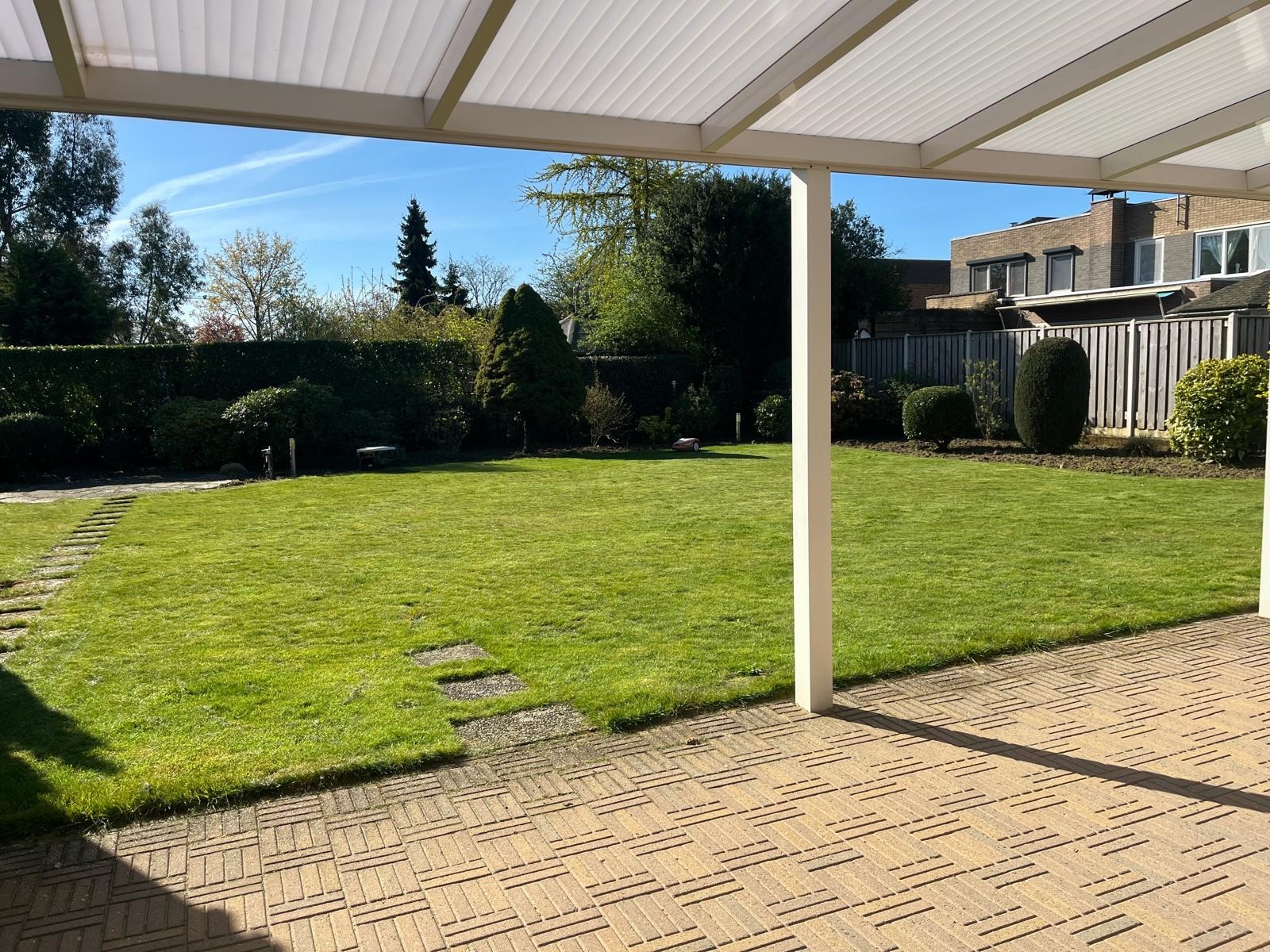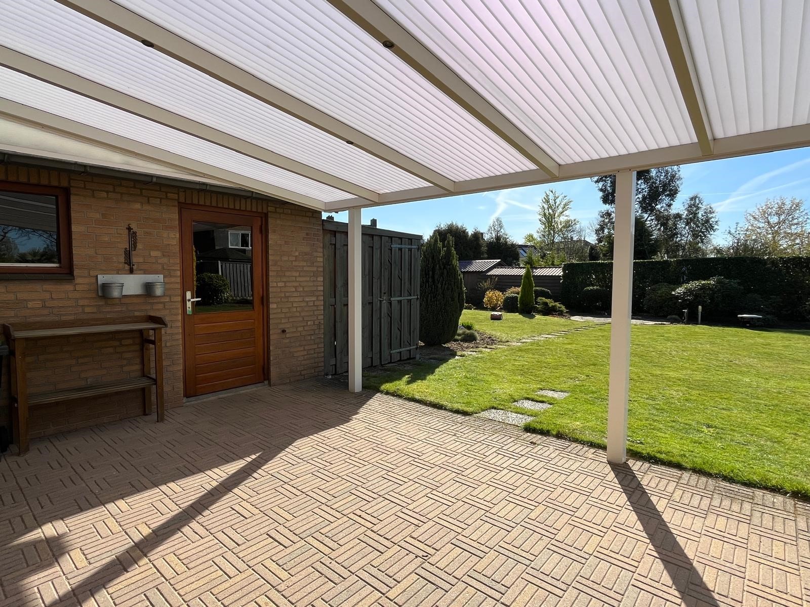 De achtertuin in L-vorm is ingericht met een ruim overdekt terras aansluitend aan het woonhuis. De overkapping van stalen staanders en doppeldeck plaat is 29 m2 en biedt u volop beschutting vroeg in het jaar én in de avonden. U kunt er heerlijk genieten én beschut zitten. Deze tuin is op het zuidoosten gelegen. Tevens is er nog een houten schuur (9 m2) welke ideaal is voor opslag van uw tuingereedschap.
