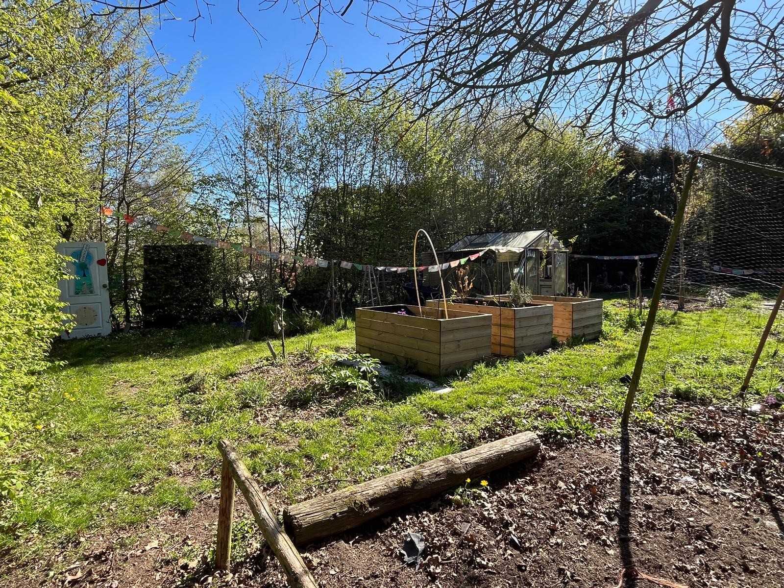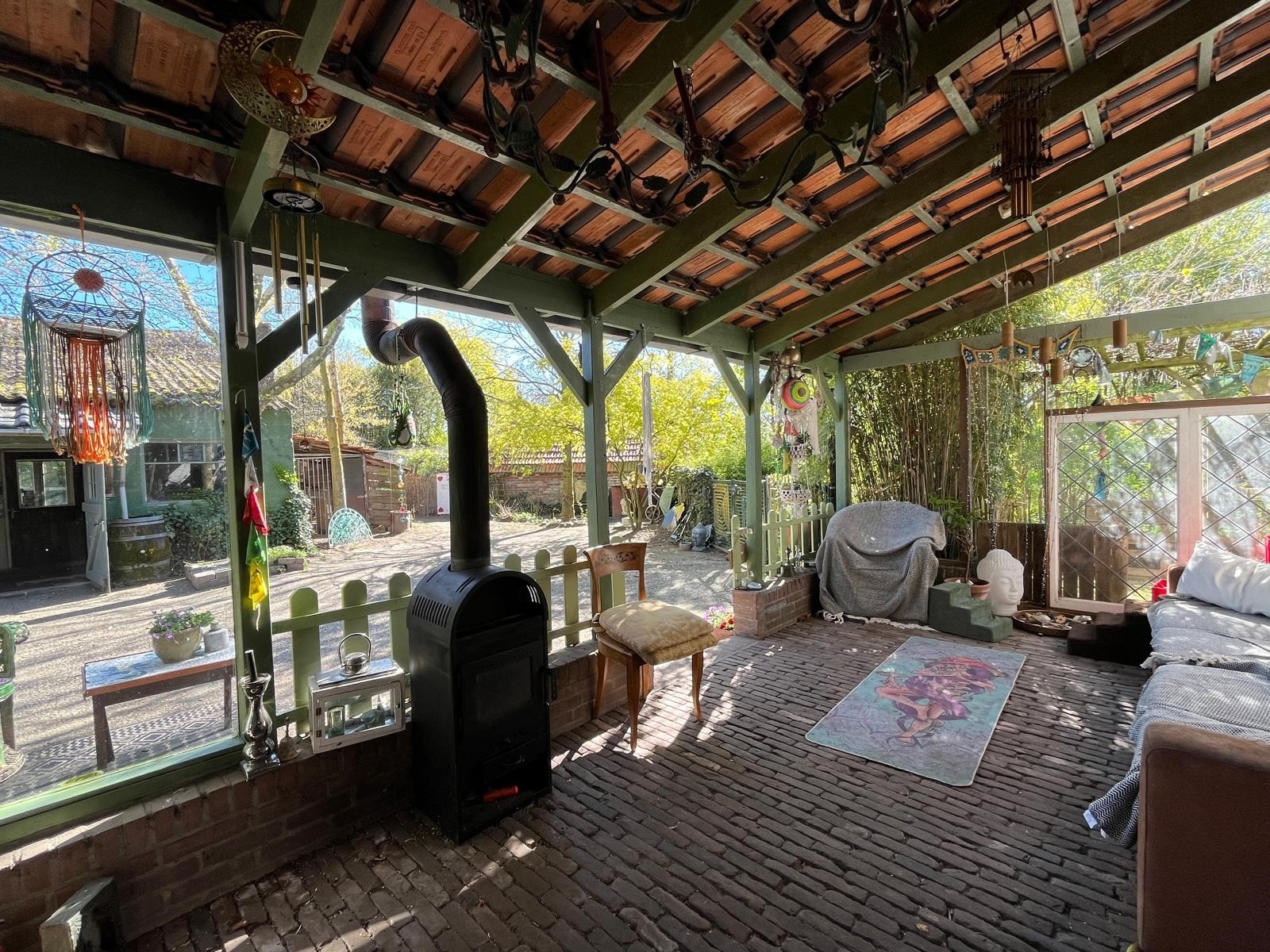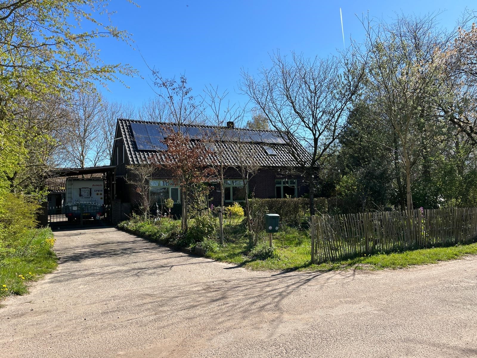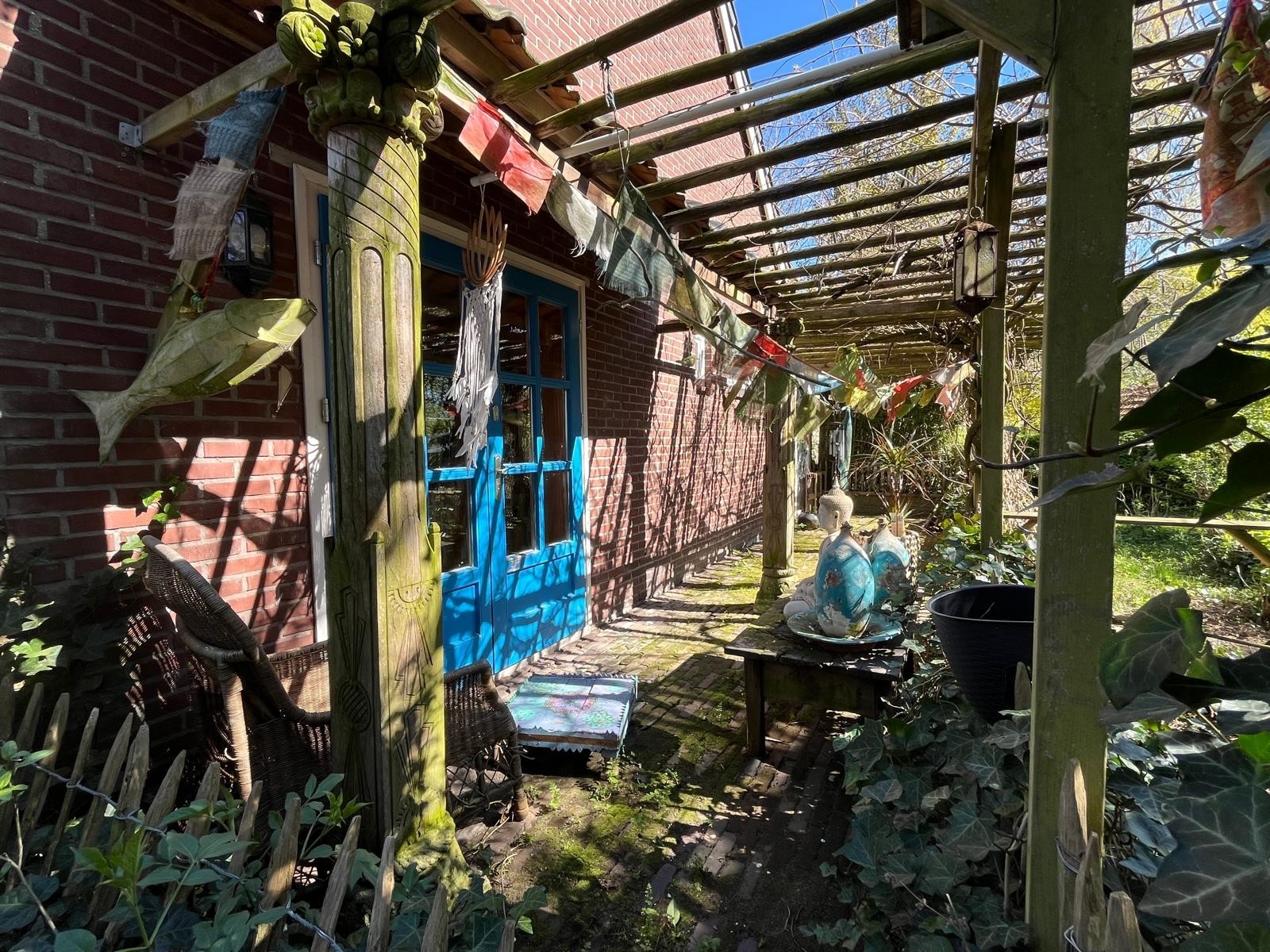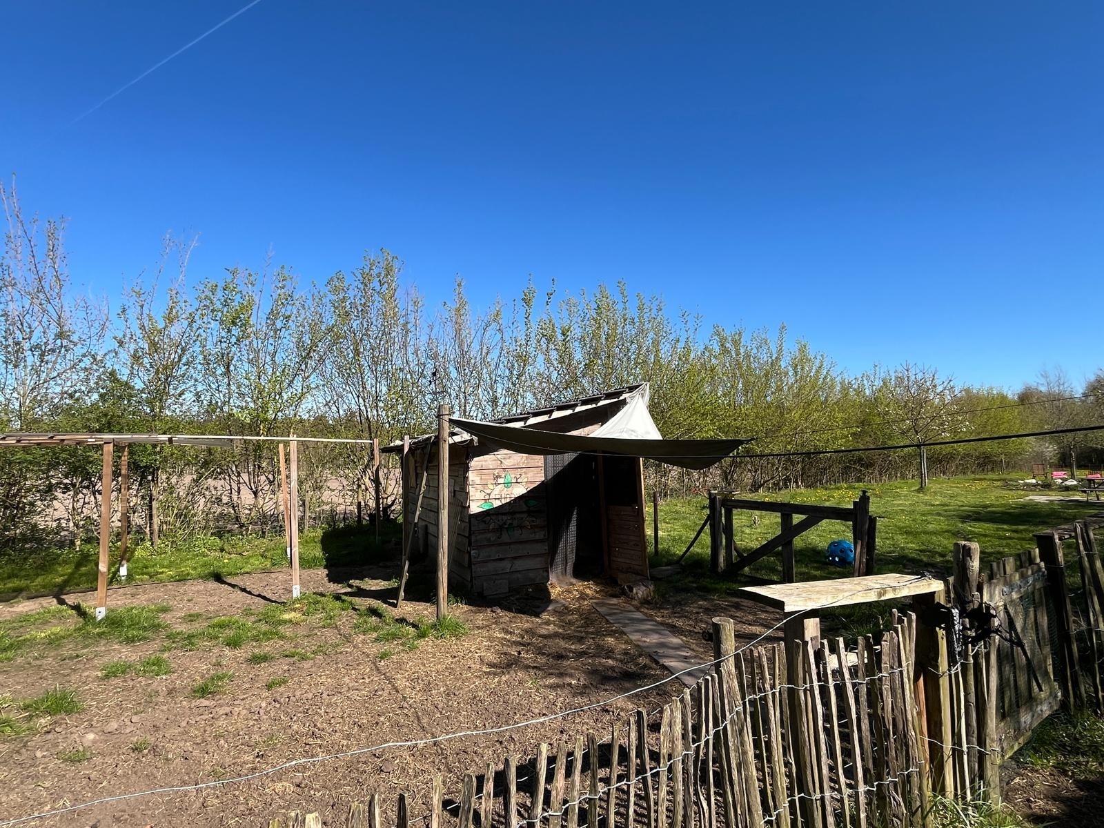 Aan de voorzijde is de toegang middels de oprit en overkapping. Er is voldoende rust en een geweldige privacy. Tevens is er nog een houtopslag en een stenen kippenhok/schuur. De tuin loopt door achter de schuur en is verdeeld in een groentetuin met kweekkas, struinpaden met doorzichten… en doorgang naar het weiland met dierverblijf met diverse fruitbomen.