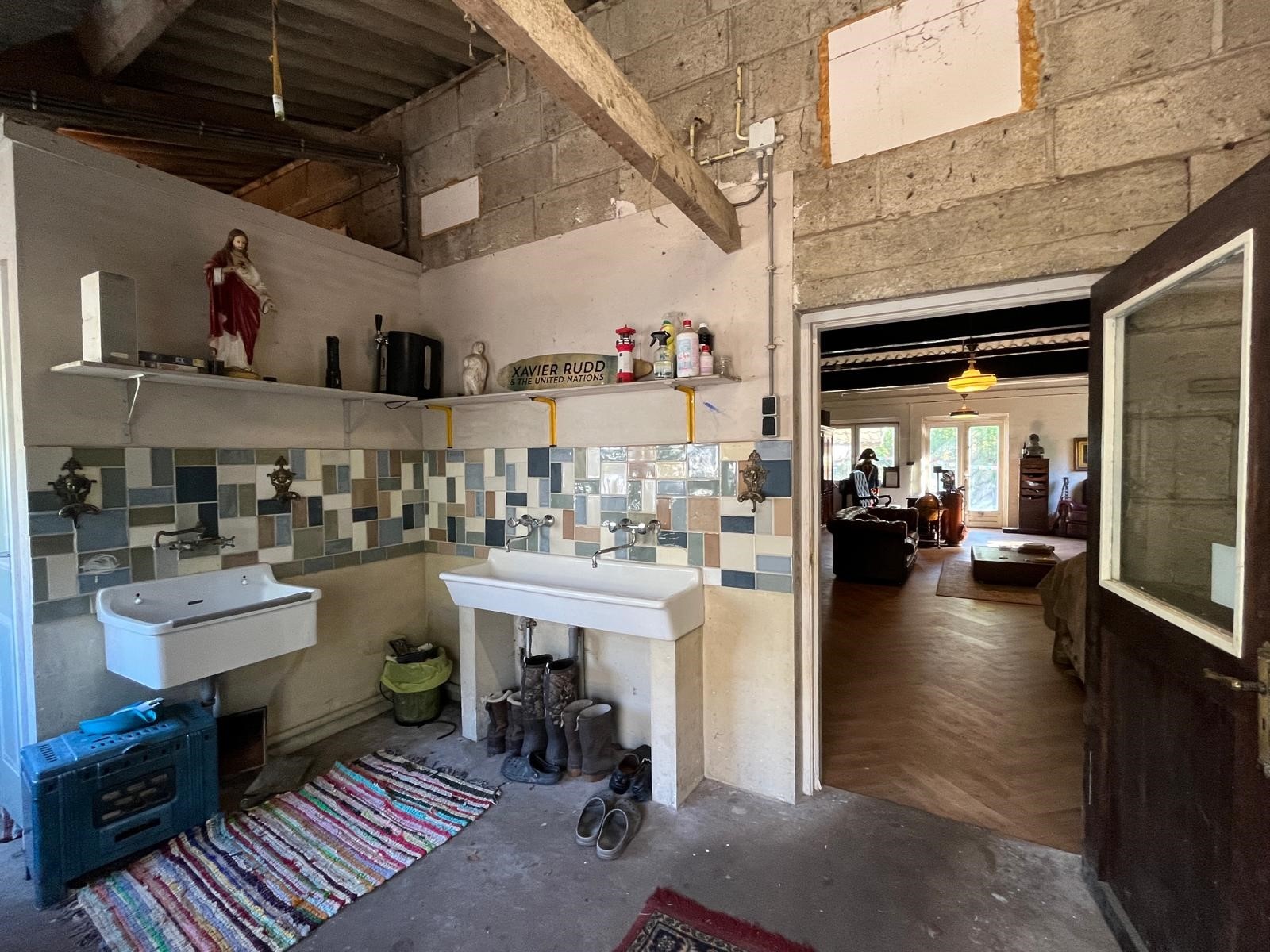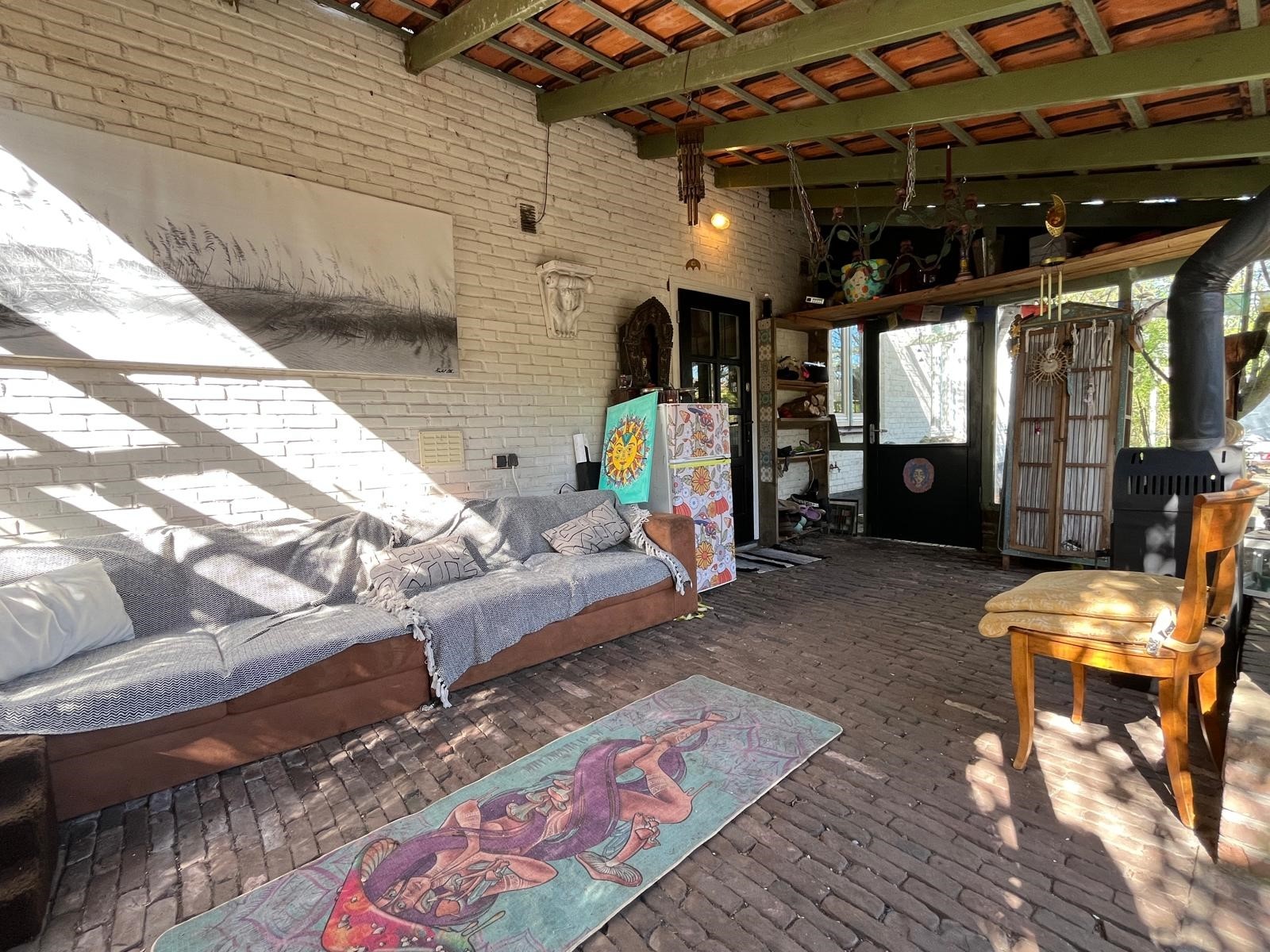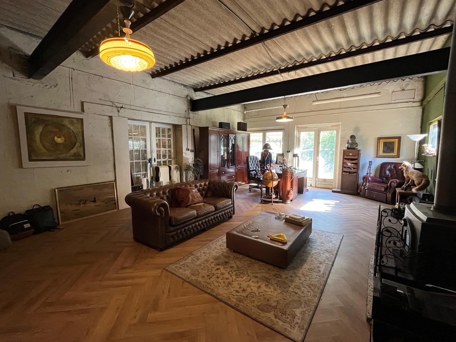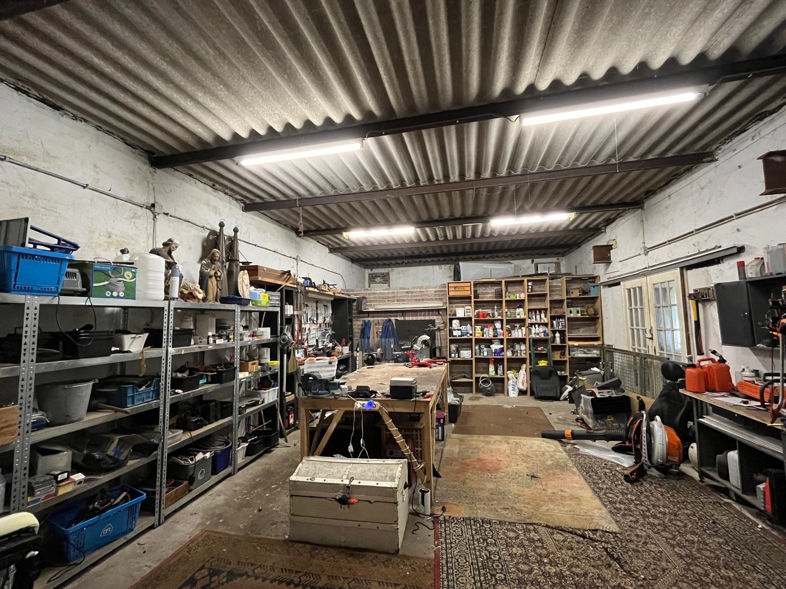 Het dak en plafond is opgebouwd uit golfplaten (Eternit). Dit gebouw is zeer divers te gebruiken: opslagruimte, atelier, instructie-ruimte, of gewoon als cave…