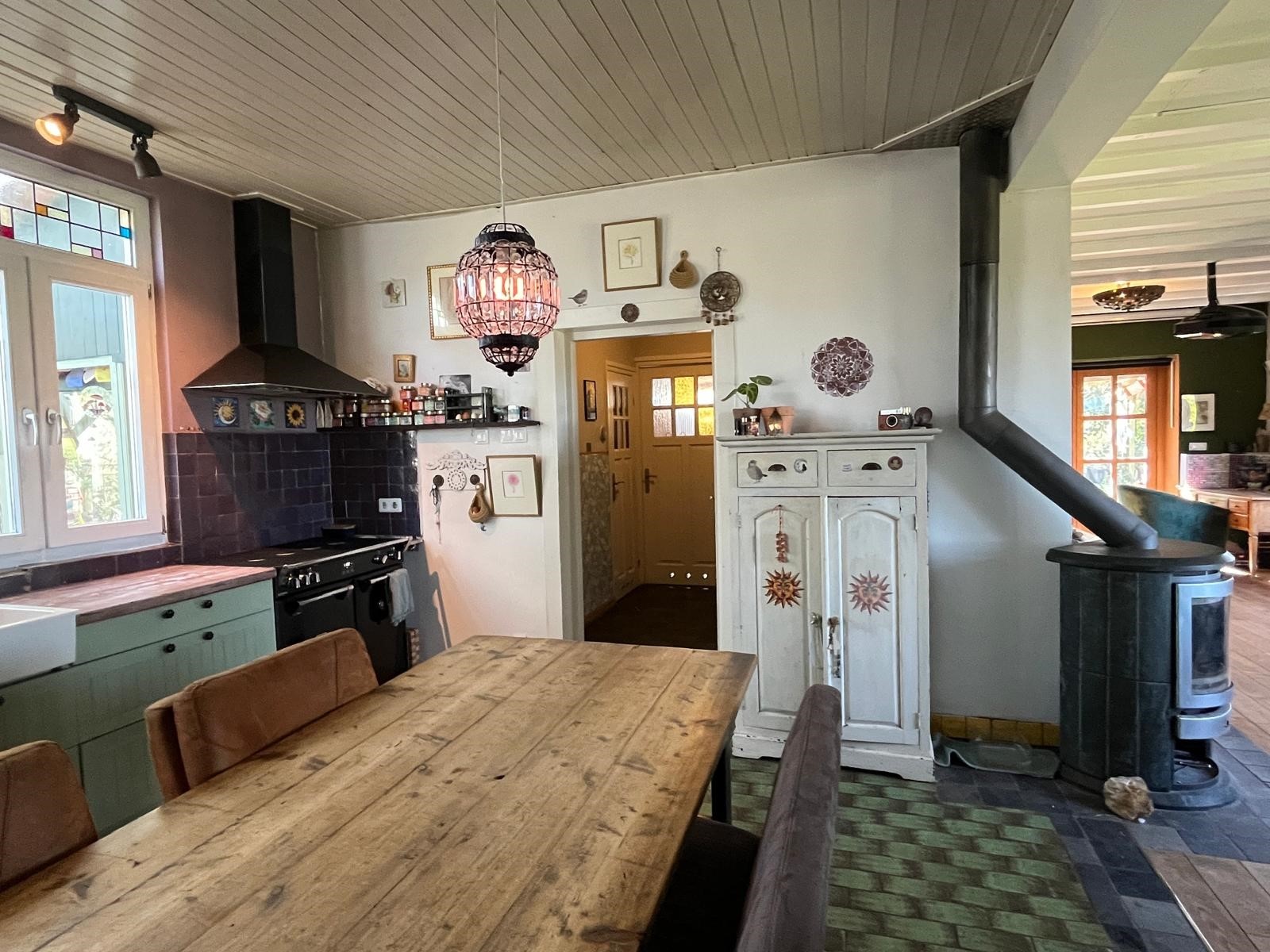 Deze ruime leefkeuken is ingericht met een aanbouwkeuken van hout en een kunststof blad, spoelbak, oven, kooktoestel, afzuigkap en koelkast. Deze keuken is open opgezet met goede zichtlijnen. Er is voldoende plek voor een eettafel. Tevens toegang tot de kelder, verdieping, opkamer hal en bijkeuken.