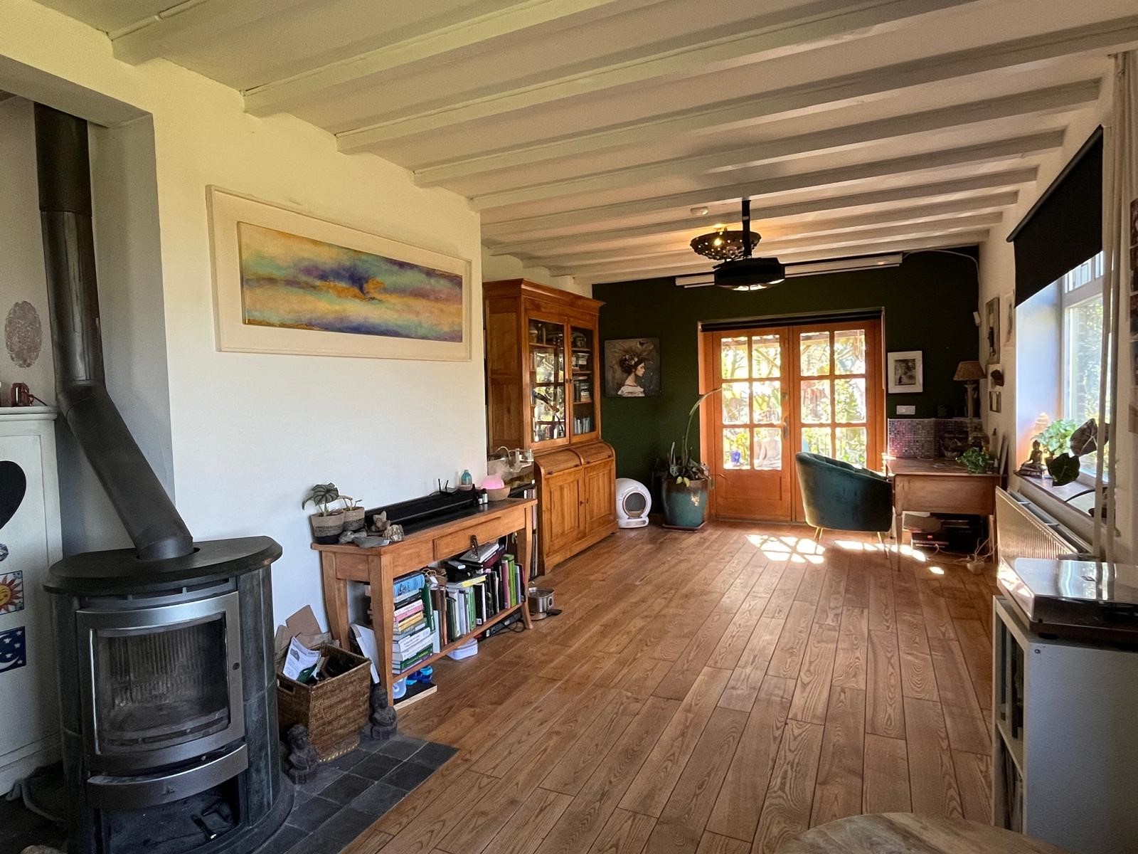 De woonkamer open verbonden met de keuken en voorzien van een houtkachel. Deze warm uitgevoerde woonkamer is voorzien van een essen plankenvloer. Aan de zijkant is een openslaande tuindeur welke toegang geeft tot de zijtuin met terras en vijver… een hele mooie plek om te genieten!