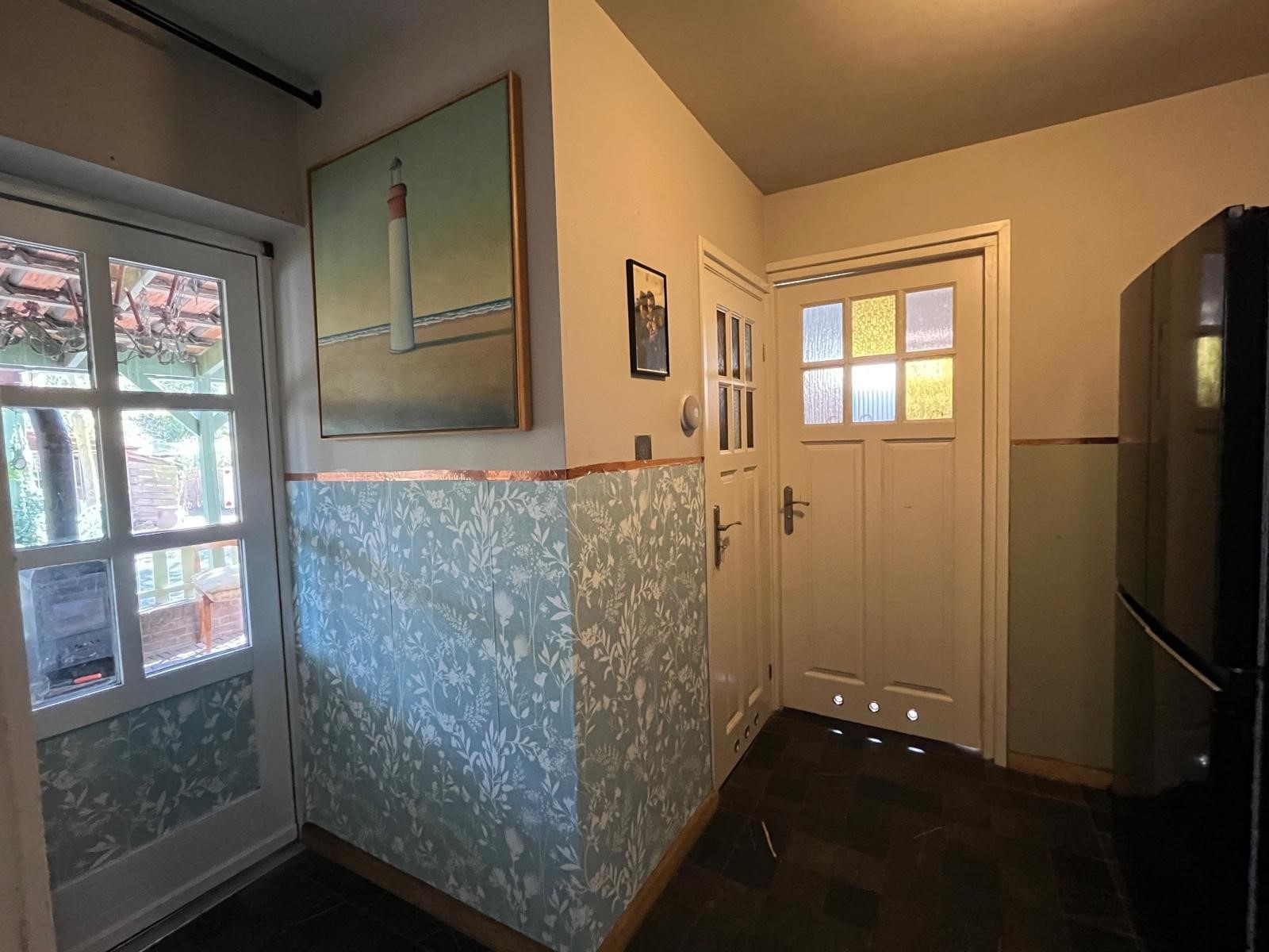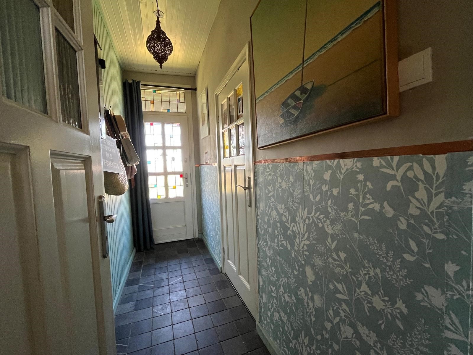 De hal is voorzien van een authentieke terrazzo vloer. Tevens bevindt zich hier de meterkast, de omvormer en garderobe.