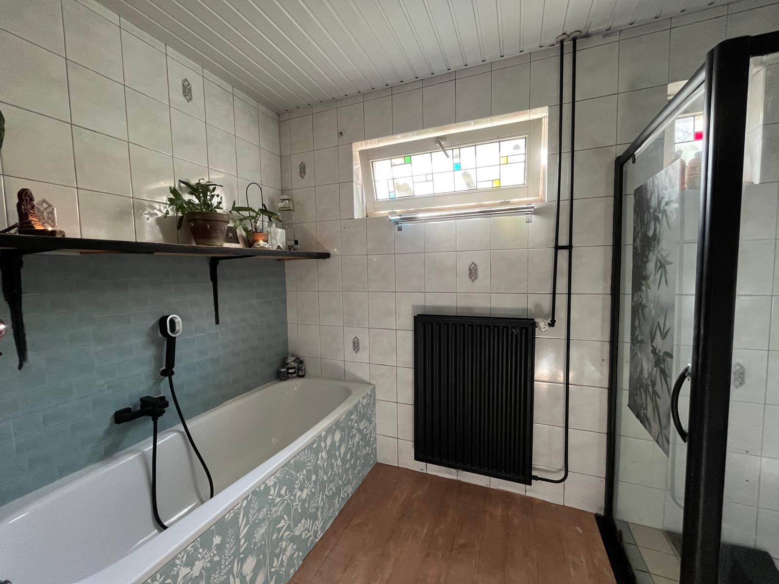 De badkamer is geheel betegeld en voorzien van ligbad, douche toilet en wastafel. Tevens zijn hier de aansluitingen voor de wasmachine.