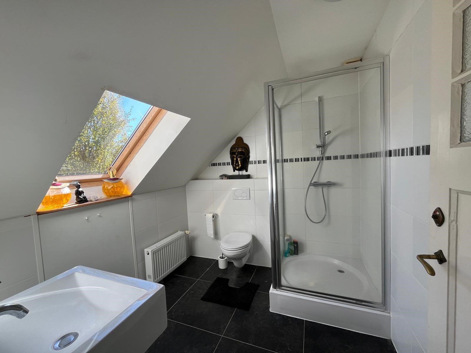De badkamer is voorzien van douche, toilet en wastafel en een Velux dakraam.