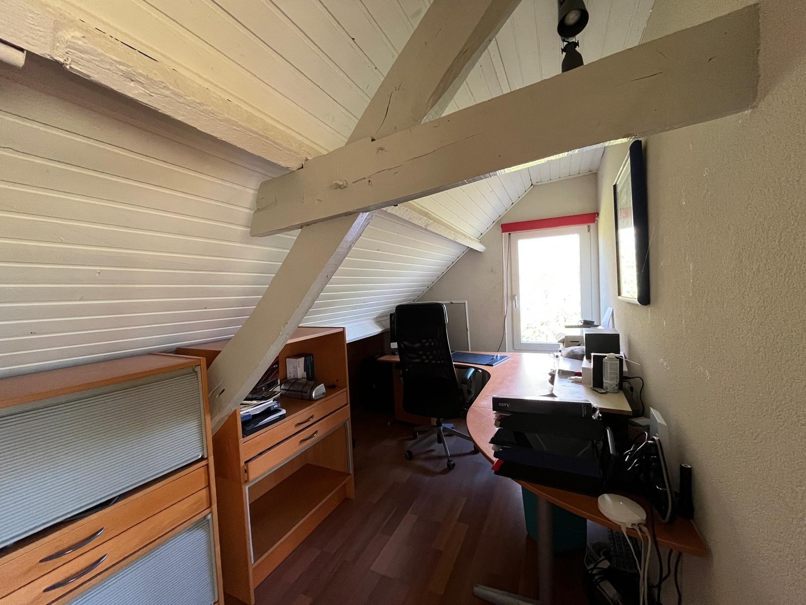 De slaapkamer doet dienst als kantoor.