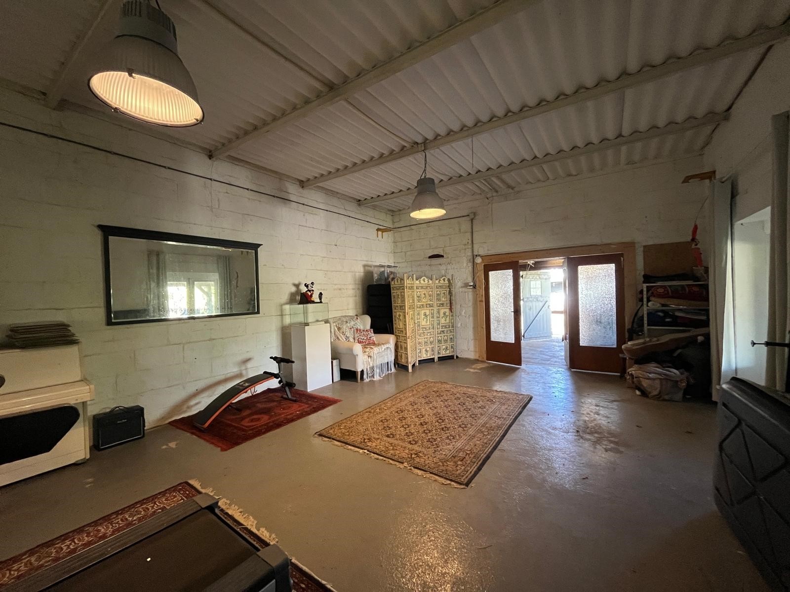 De schuur is aan de voorzijde toegankelijk via een houten openslaande poorten enkele loopdeuren. Deze ruimte is verdeeld in een centrale gang met toilet en wasruimte.